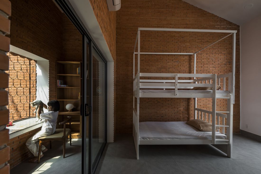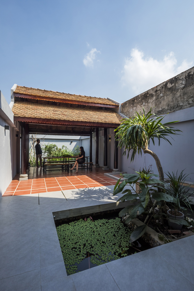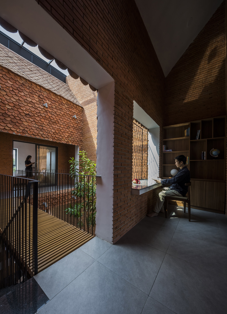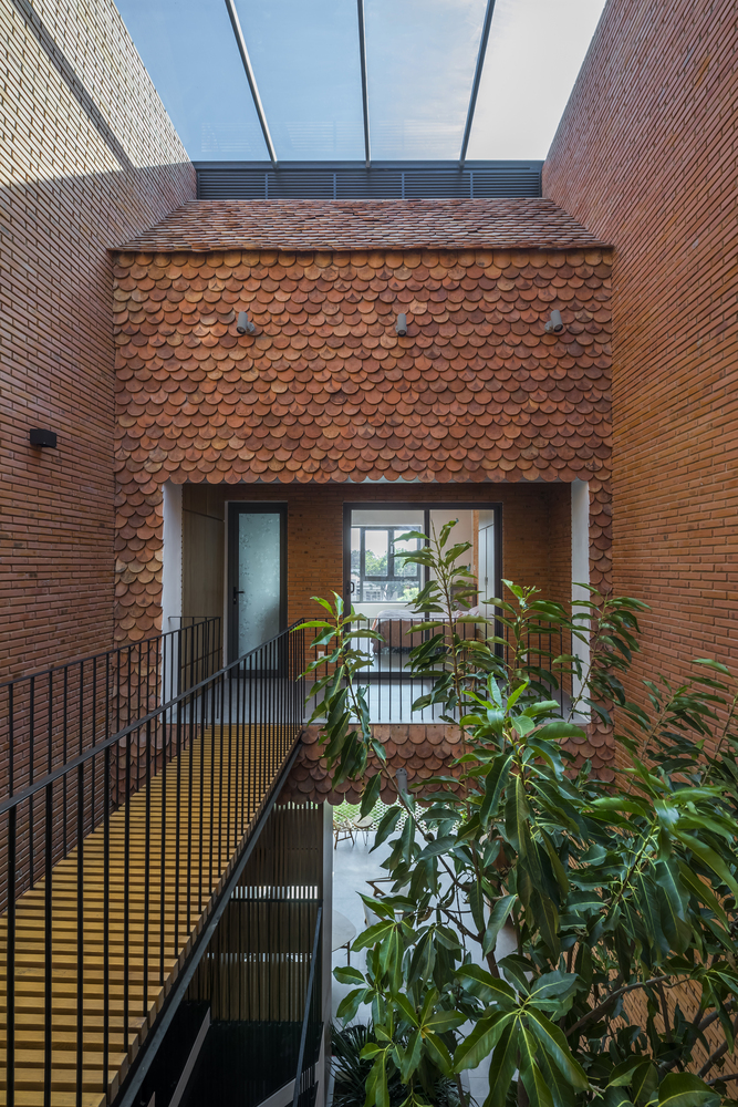 Ngoài xác định đủ nhu cầu xây dựng thì yếu tố cân đối sử dụng tường gạch thô còn giúp giảm chi phí hoàn thiện tường hoặc chi phí bảo dưỡng hàng năm cho các trường hợp nứt, sơn, sửa tường. Ngói vảy cá cũ được tái chế đã mang dấu ấn màu sắc của thời gian, cho ta cảm giác mộc mạc, gần gũi mà màu ngói mới khó có được. Hệ thống ngói vảy cá bao bọc bốn mái hiên trong và ngoài nhà tạo nên hình khối hài hòa với công năng sử dụng.