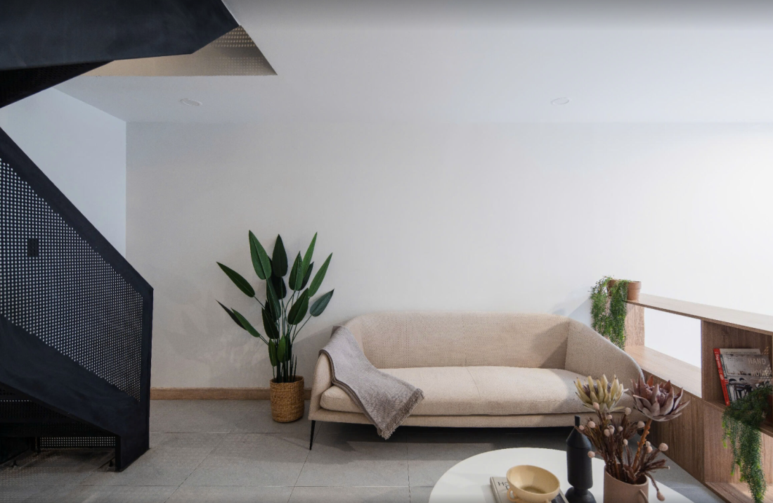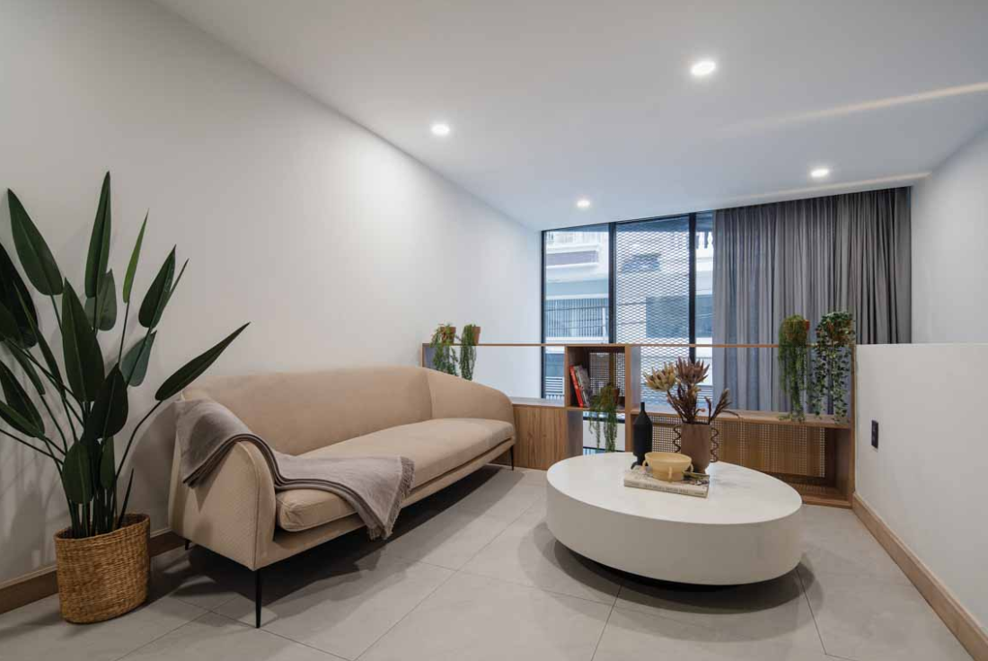 Tầng lửng lại là phòng khách bài trí khá đơn giản chỉ với bộ sofa màu kem, bàn trà và kệ trang trí.