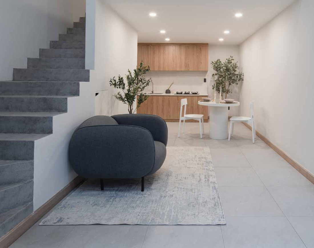 Tầng trệt: sống động trong không gian mở; một không gian mở nơi phòng khách và bếp hòa làm một. Thiết kế này không chỉ tiết kiệm diện tích mà còn tạo điều kiện để mọi người dễ dàng trò chuyện, kết nối.