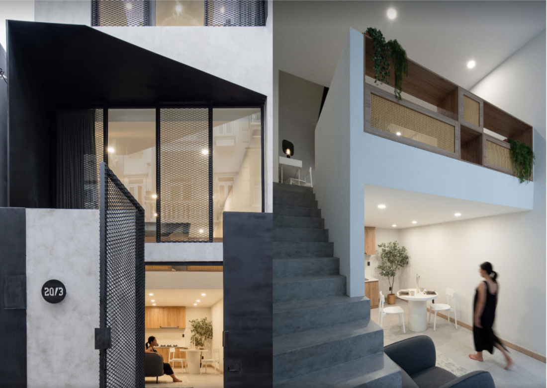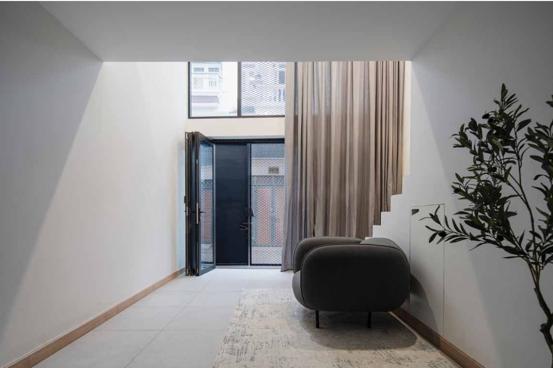 Thay vì xem diện tích nhỏ là rào cản, kiến trúc sư đã biến nó thành cơ hội để sáng tạo, mang đến một không gian sống hiện đại, thoáng đãng và tiện nghi bất ngờ. Ngay khi đặt chân vào nhà, bạn sẽ cảm nhận được sự kết nối tinh tế giữa các yếu tố thiết kế. Từ khung cửa sổ, tay nắm cửa, đèn tường, cho đến giếng trời – mọi thứ đều được sắp xếp đồng bộ, tạo nên một ngôn ngữ thiết kế rõ ràng và sang trọng. Chính sự chăm chút này đã làm cho không gian nhỏ trở nên mạch lạc và cuốn hút hơn bao giờ hết.