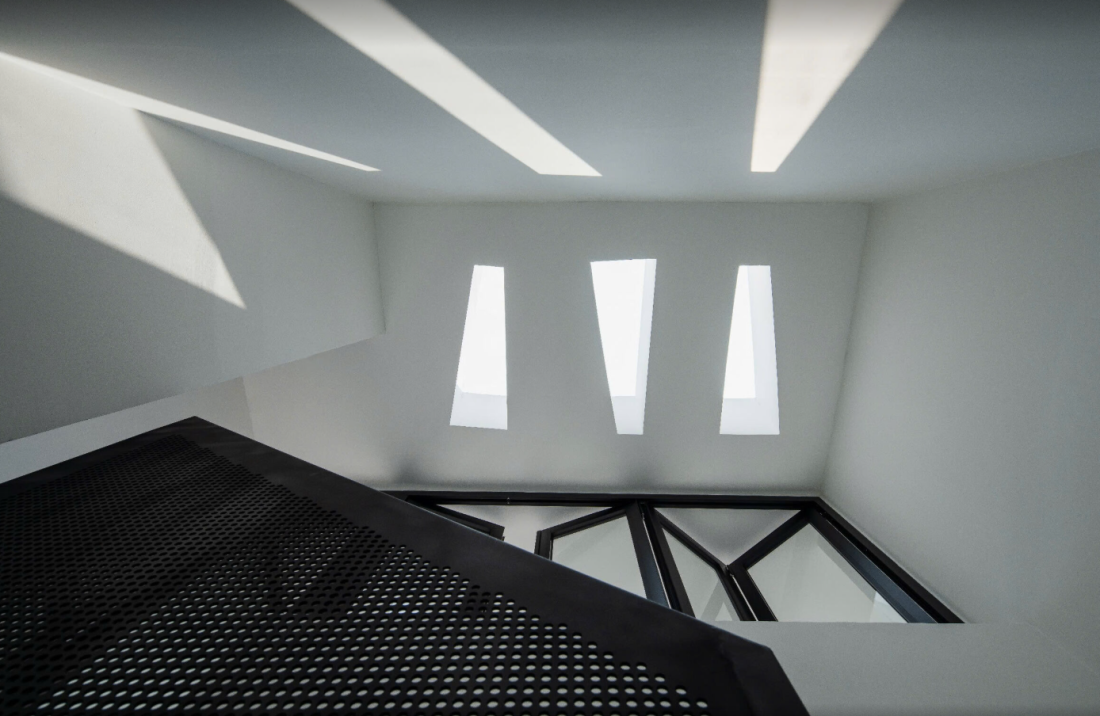Kiến trúc sư đã khéo léo tận dụng chiều cao và sự trong suốt để nới rộng không gian. Mặt tiền bằng kính cao từ sàn đến trần, kết hợp với khung tối giản, cho phép ánh sáng tự nhiên ùa vào khắp nhà.