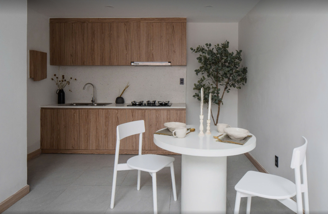 Bước vào bên trong, là bàn ăn và gian bếp nhỏ, bạn sẽ thấy không gian bừng sáng với đá mài trắng (terrazzo), vừa hiện đại vừa sạch sẽ. Thêm vào đó, tông màu gỗ sồi ấm áp mang đến cảm giác gần gũi, dễ chịu. Các tủ âm tường được bố trí thông minh, vừa tiện lợi vừa giữ cho ngôi nhà luôn gọn gàng.