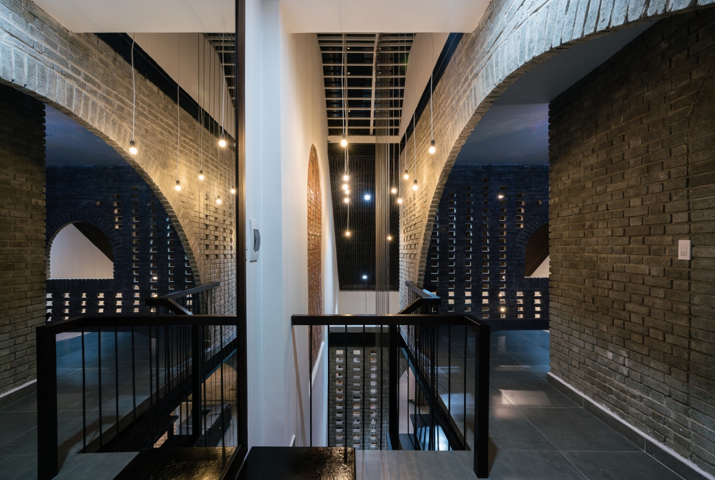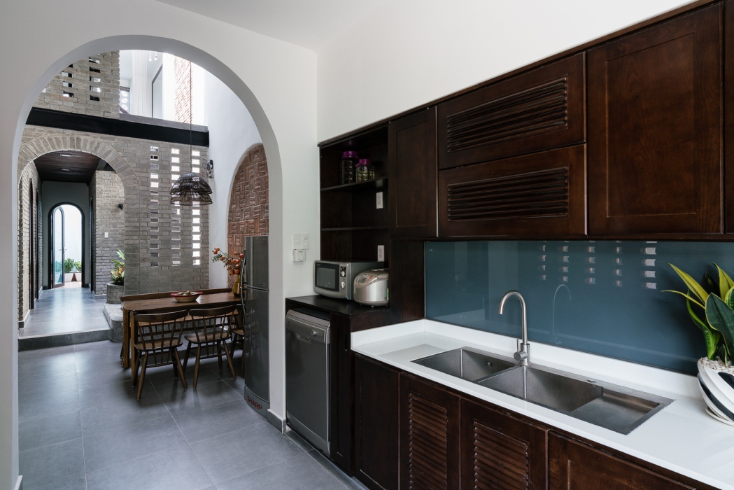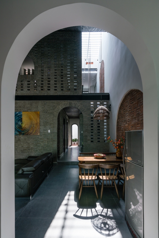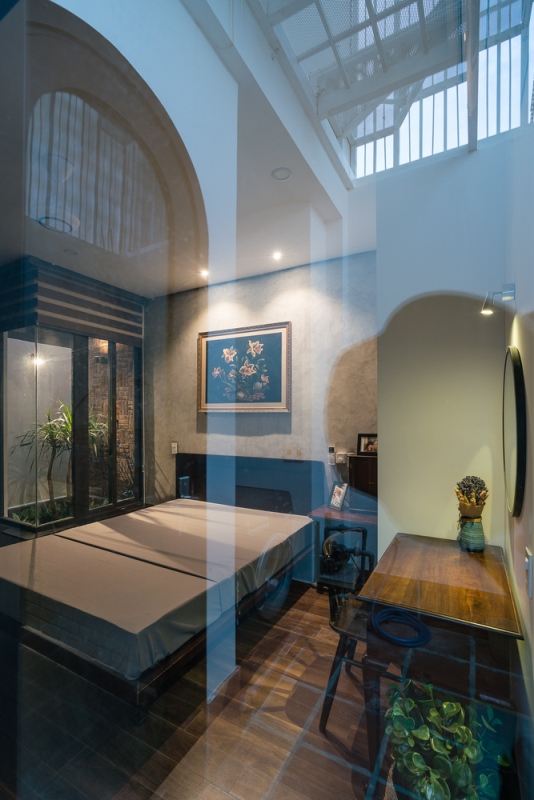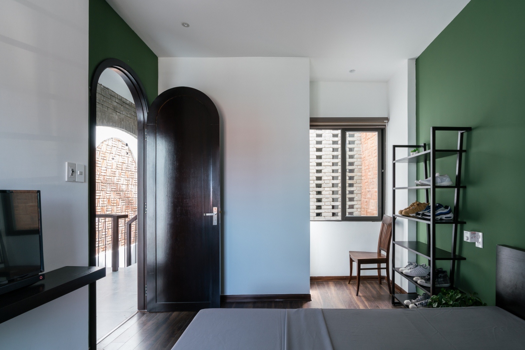 Bên trong ngôi nhà, các phòng ngủ ta có thể thấy những thay đổi của ánh sáng, gió hằng ngày. Ngoài ra vật liệu chính vẫn là gạch thô và gỗ tự nhiên hòa cùng hình dạng mái cong gợi lên hình ảnh những ngôi nhà vùng nông thôn Việt.