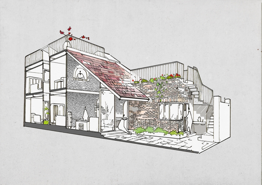 Gia chủ là cặp vợ chồng đã về hưu, muốn trở về với thiên nhiên, sự yên tĩnh và bầu không khí ấp cúng của các thành viên. Giải pháp là đưa các không gian công cộng của ngôi nhà lên phía trước, hướng cửa ra vào chính, nơi sẽ có phòng khách, phòng ăn, và bếp tạo thành sự kết nối giữa ánh sáng tự nhiên vào nhà thông qua các vật liệu gạch nung thô đồng thời cũng giúp ngôi nhà có chiều sâu hơn.