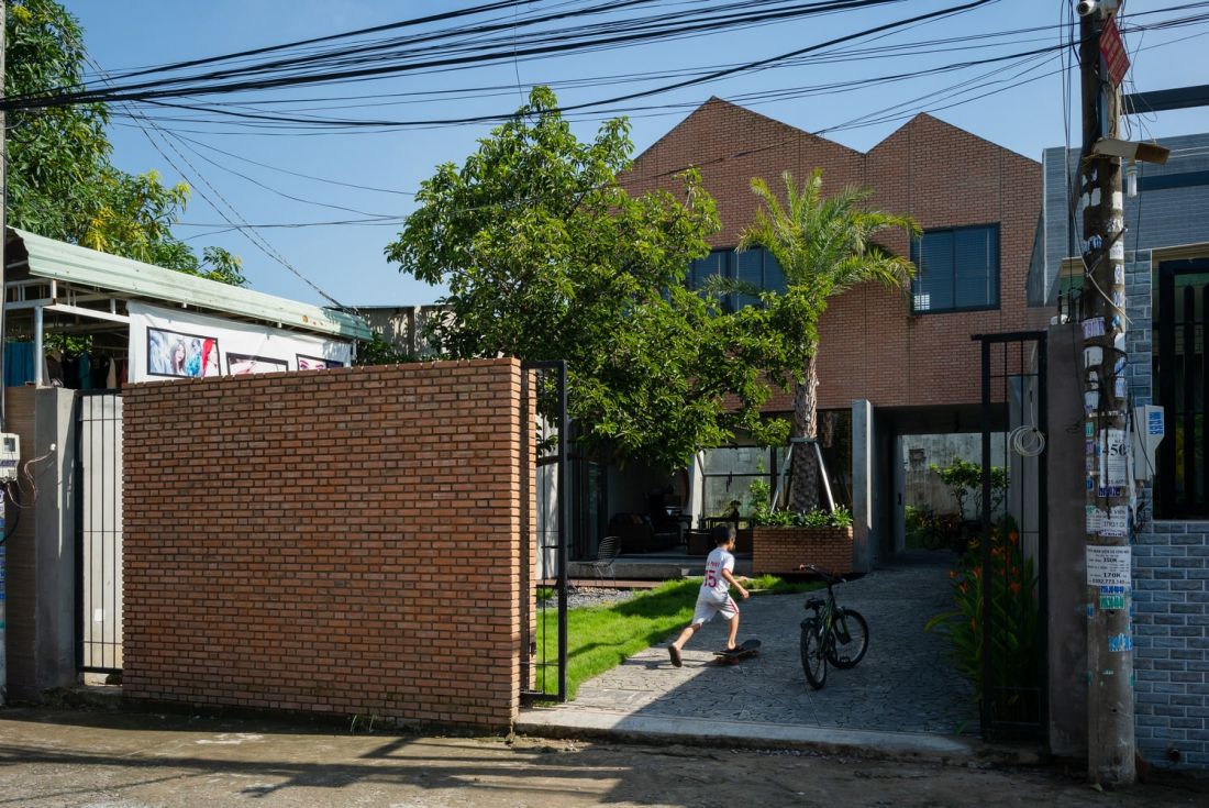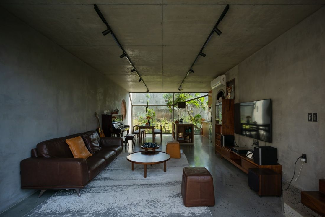Trong và ngoài nhà các bức tường đan xen giữa bê tông và gạch thô mang đến cảm giác gần gũi với thiên nhiên hơn, không có ranh giới nội thất và ngoại thất. Tầng 1 gồm 3 phòng ngủ và không gian đọc sách. Hệ kệ sách thiết kế phân bố từ mảng tường đến hai bên hướng cầu thang nhà.