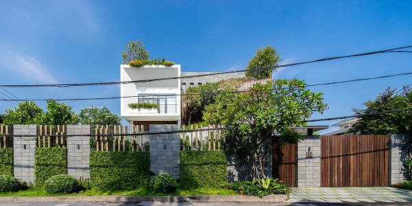 Từ bên ngoài, hàng rào phủ đầy cây xanh tươi rói khiến người đi qua như lạc vào một vương quốc đây bí ẩn mà chỉ để lộ kiệt tác rạng rỡ phía sau ngôi nhà. Ngay phía sau cánh cổng, một sự phô trương các hinh dạng cũng rất lạ kì, kết hợp giữa các thanh gỗ trượt của kiểu nhà bậc thang, tất cả đều làm cho ngôi nhà trở nên độc đáo thực sự.