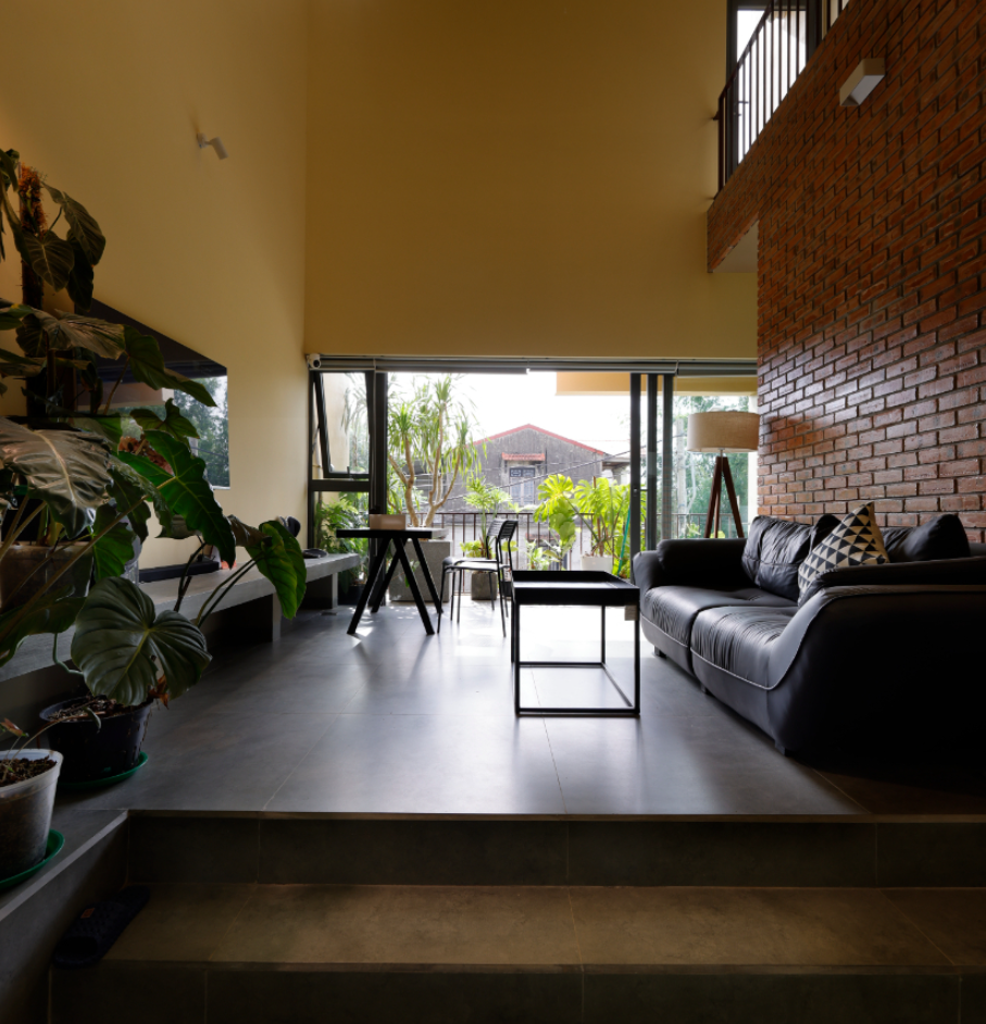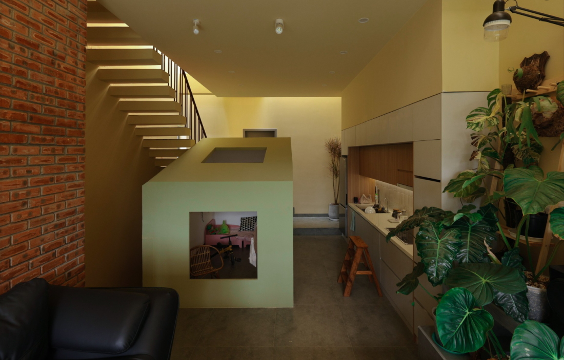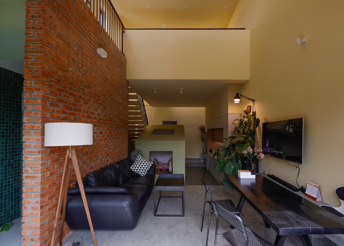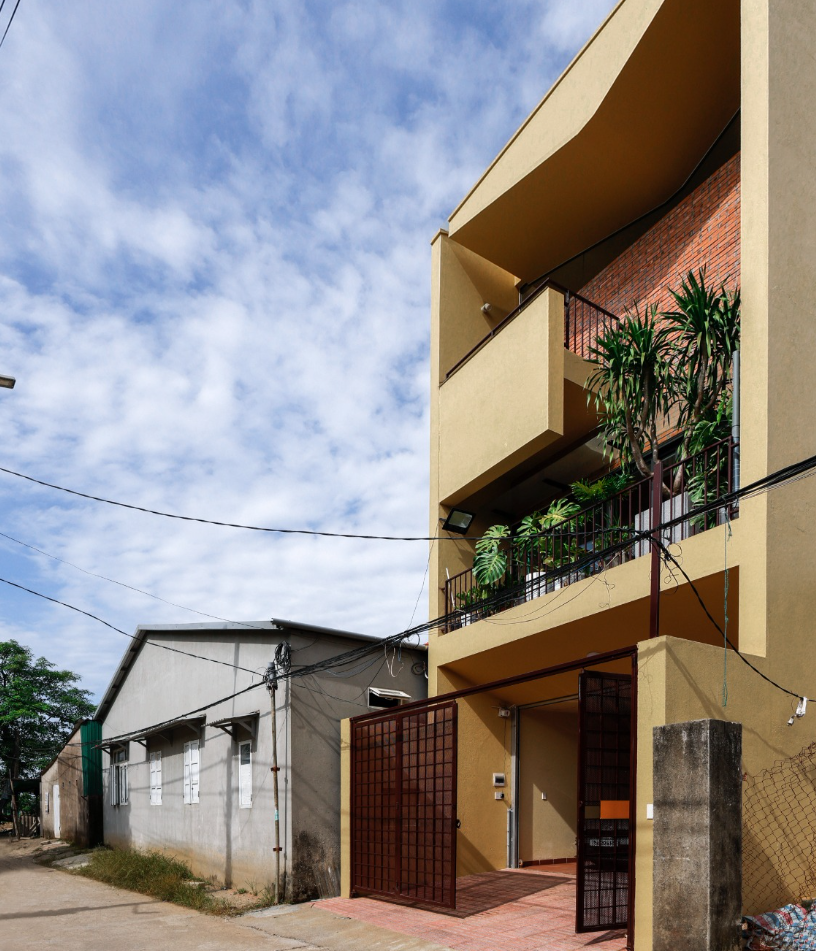 Ngôi nhà được thiết kế để “đối mặt” với sự thay đổi của quá trình đô thị hóa, nhưng vẫn giữ được nét mộc mạc qua cách sử dụng gạch thô, gỗ tự nhiên, và cấu trúc đơn giản.