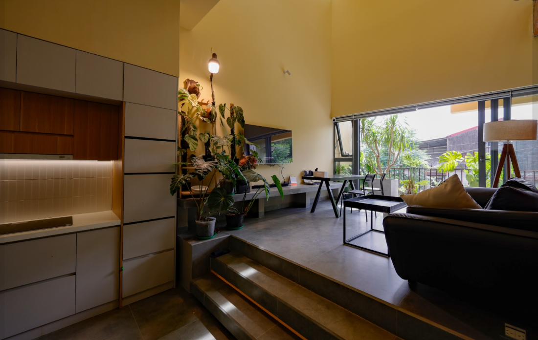 Thêm vào đó, các tầng trong nhà được kết nối bằng sự thay đổi độ cao sàn, giúp giảm bớt số bậc thang liên tục mà vẫn tạo cảm giác lưu thông liền mạch. Đây là một chi tiết thiết kế thông minh, vừa mang tính ứng dụng cao, vừa đảm bảo thẩm mỹ.