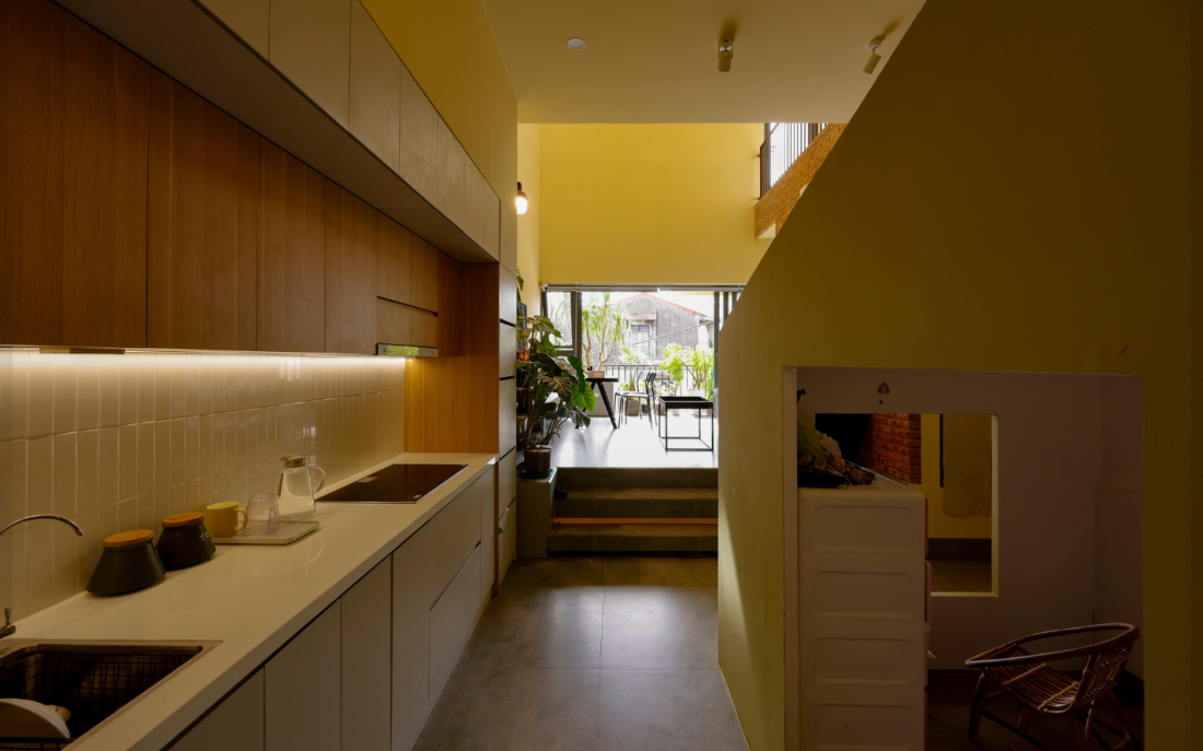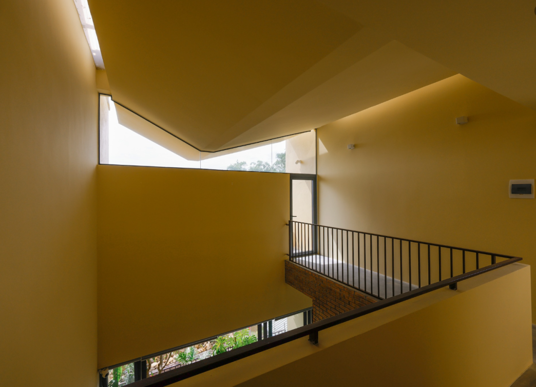 Ngôi nhà không chỉ là một nơi để ở, mà còn là một hành trình trải nghiệm không gian sống. Dọc theo các lối cầu thang và hành lang, ánh sáng tự nhiên được tận dụng tối đa, kết hợp với những khoảng không gian mở, tạo nên cảm giác thông thoáng và gần gũi với thiên nhiên.