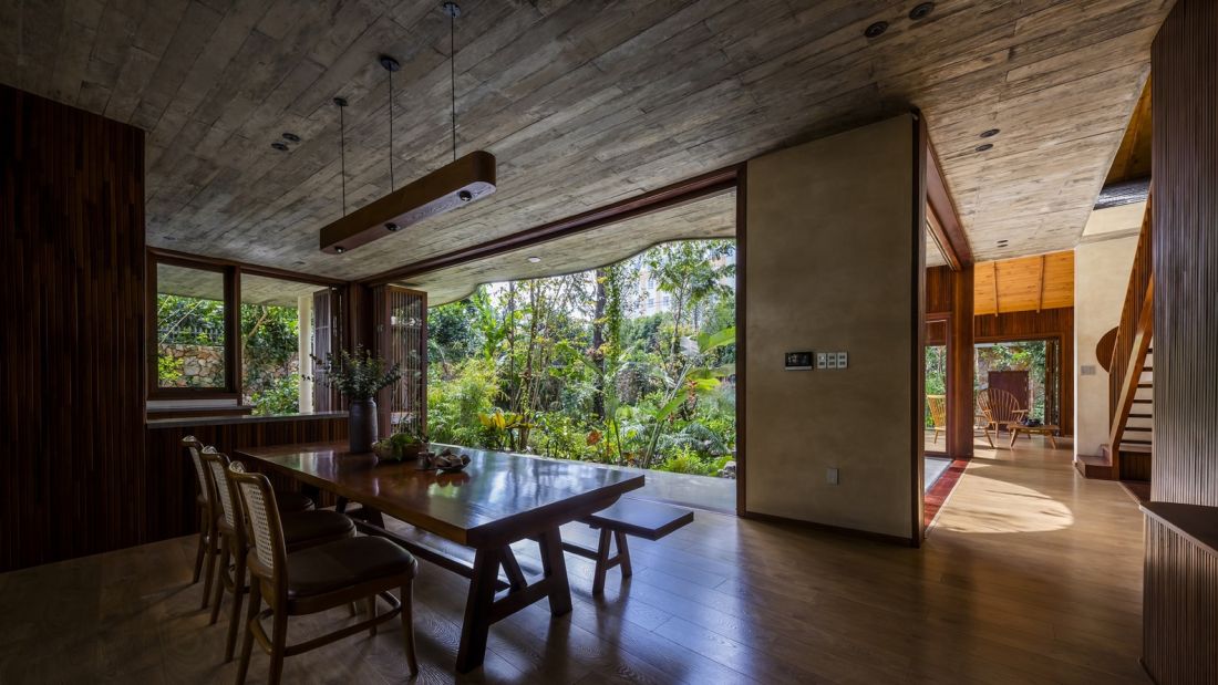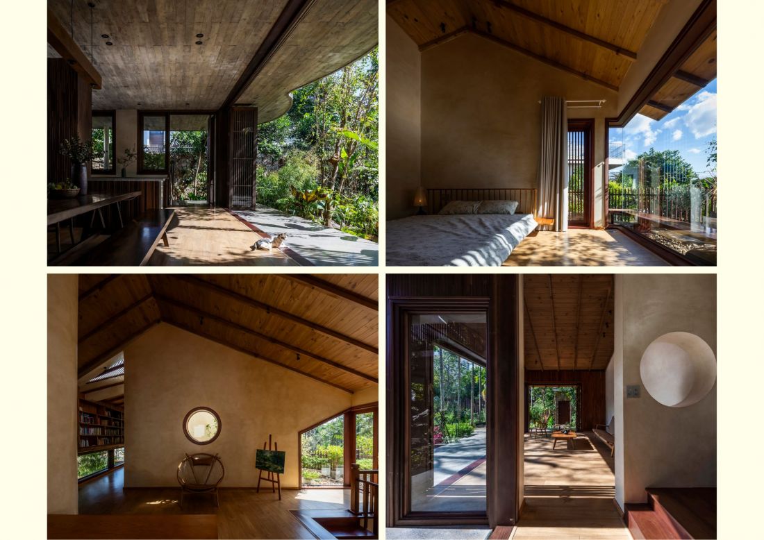 Về xây nhà, tầng trệt gồm có phòng khách và bếp được liên thông với nhau bằng một lối đi nổi trên mặt suối. Khu vực nghỉ ngơi được đặt phía sau, bao quanh là sự riêng tư và yên tĩnh của sân vườn. Tầng 1 là khu vực đọc sách và phòng làm việc tại nhà với 2 phòng ngủ đan xen cùng không gian đệm của cây xanh.