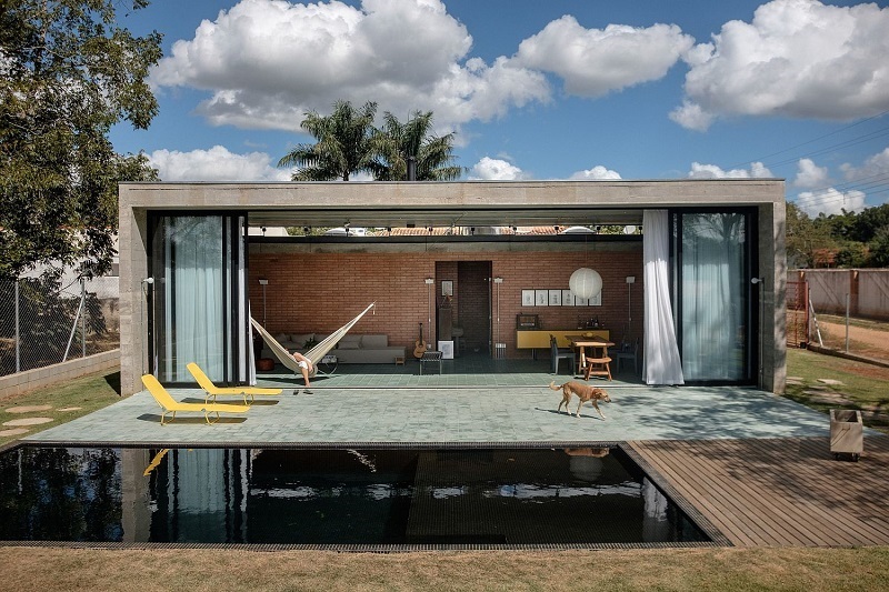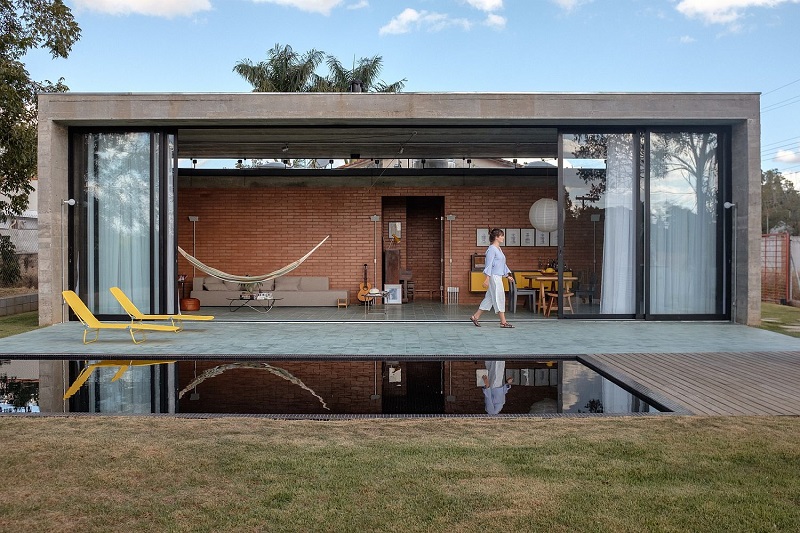 Cửa kính trượt tạo nên sự giao thoa, gần gũi hơn giữa không gian trong - ngoài. Bể bơi phía trước mang lại sự trong lành, mát mẻ cho toàn bộ căn nhà.
