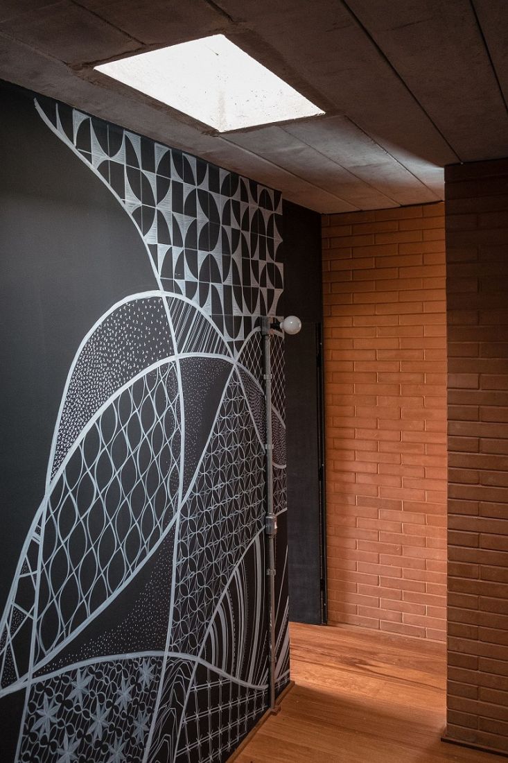 Giếng trời mang ánh sáng ngập tràn, sự thông thoáng cho căn nhà kiểu cách ở Brazil này. Một bức tường nghệ thuật trừu tượng cũng rất nổi bật.