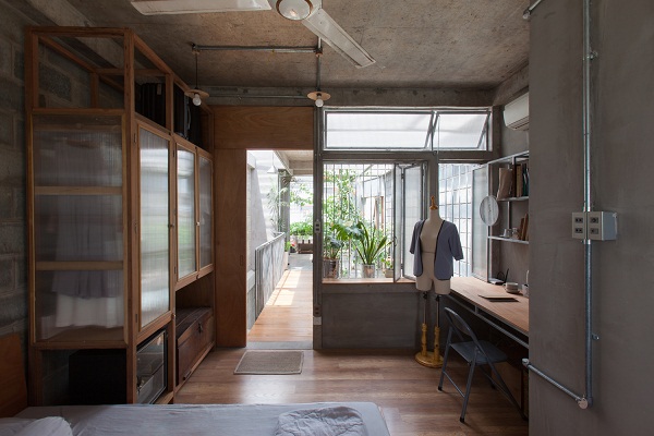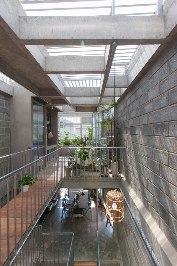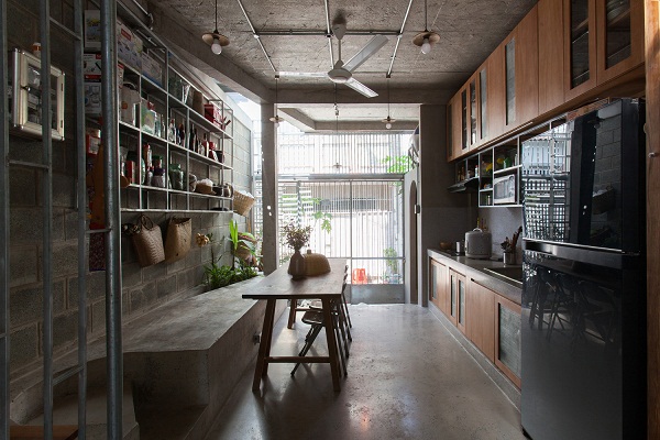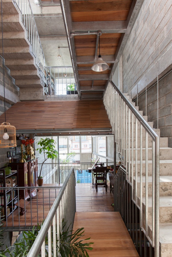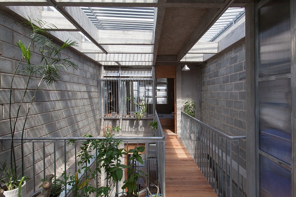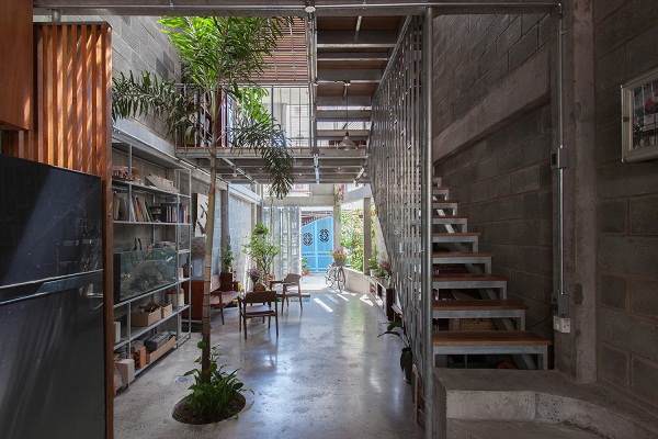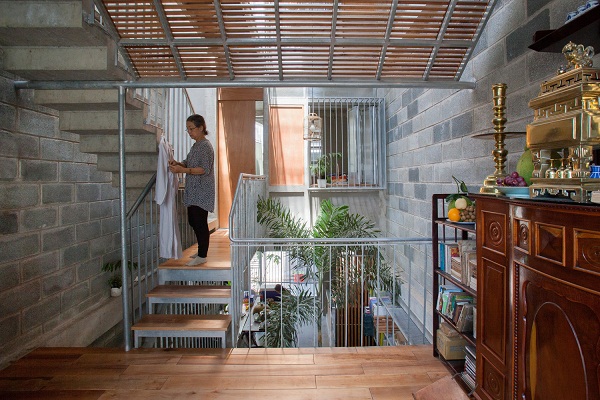 Ngôi nhà được xây dựng nằm ở giữa hai đầu của một con hẻm cụt, trong đó tầng 1 được để trống giúp luồng di chuyển của con người và không khí lưu thông liên tục.