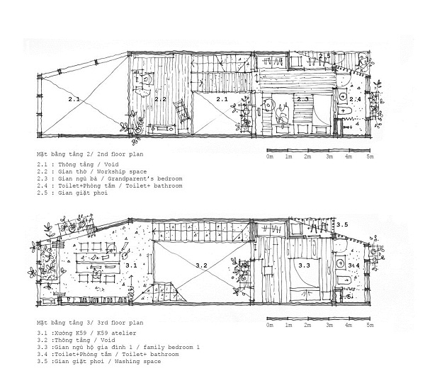 Tầng tiếp theo được chia làm hai phần, phía trước là không gian thờ cúng, xưởng thiết kế và một vườn rau, phía sau là không gian riêng bao gồm phòng ngủ, nhà vệ sinh và khu vực phơi phóng.