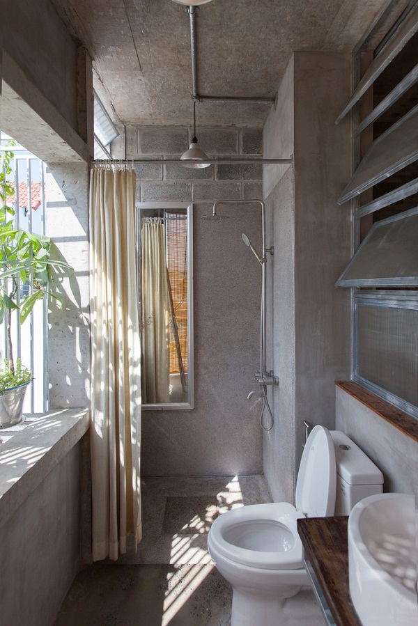 Không gian vệ sinh được bố trí hướng về phía rạch Bà Bướm giúp cho không gian được thông thoáng và làm khoảng đệm cho không gian phòng ngủ.