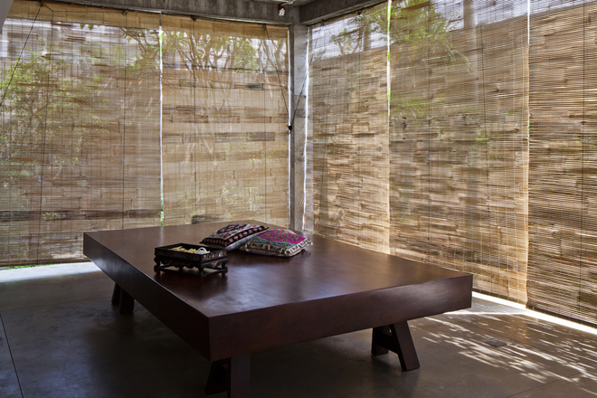 Ngôi nhà ba tầng nằm trên khu đất 200 m2 có hàng rào cao 3m bao quanh để đảm bảo an ninh. Nhưng bức tường với nhiều đường gờ kết hợp với cửa gỗ đơn giản không có sự nặng nề mà trái lại, đem lại cảm giác thiền, bình yên, nhẹ nhàng nhờ hàng trúc quân tử trồng xung quanh. Ngoài ra, nhà còn có hệ thống an ninh và vào buổi tối, chủ nhà sẽ đóng cửa kéo bao quanh toàn bộ khu sinh hoạt chung tầng 1 để đảm bảo an toàn.