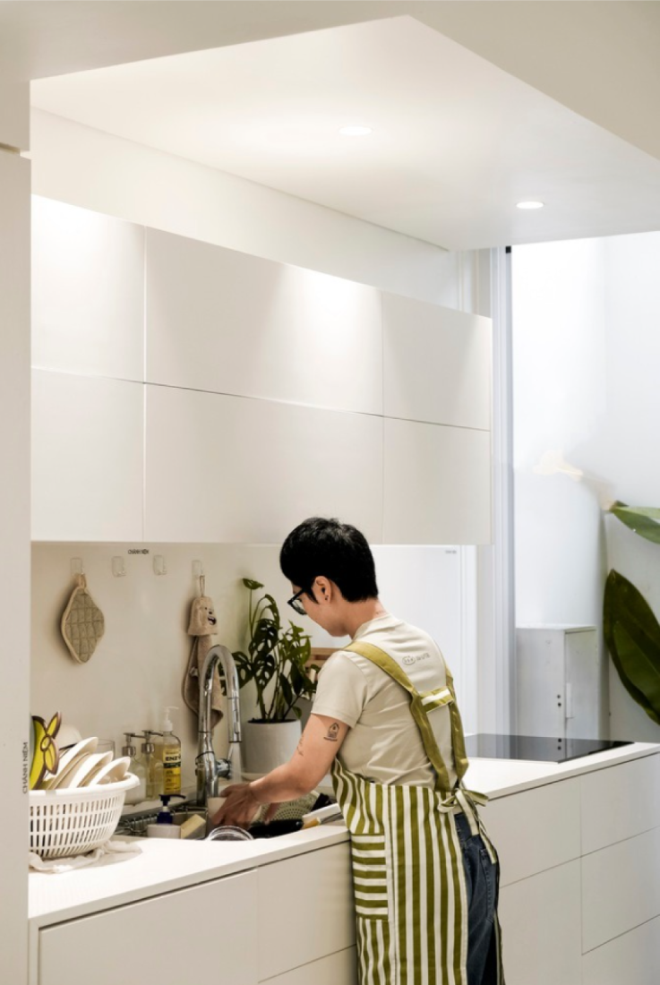 Ngôi nhà sử dụng tông màu trắng làm chủ đạo, kết hợp với những món nội thất tối giản với chất liệu gỗ tự nhiên được lựa chọn kỹ lưỡng, vừa ấm áp, vừa gần gũi.