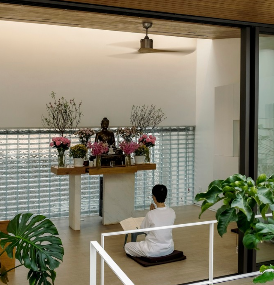Ngôi nhà còn là không gian thiền định và tổ chức các buổi sinh hoạt Phật giáo. Phòng thờ được thiết kế đặc biệt, với ánh sáng tự nhiên chan hòa và sự kết hợp hài hòa giữa các yếu tố cây xanh và nội thất tối giản. Đây là nơi gia chủ có thể dành thời gian tĩnh tâm, kết nối với chính mình và với những người thân yêu.