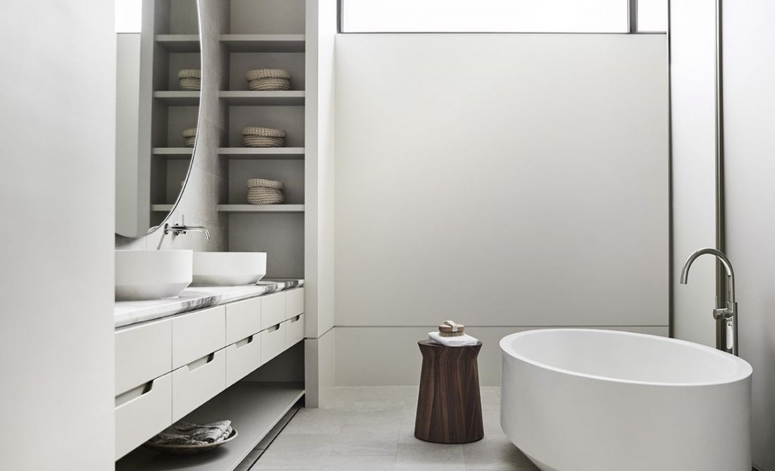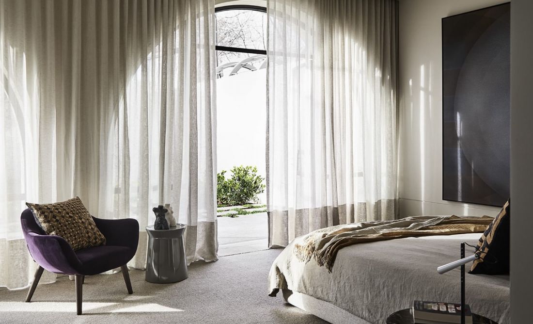 Phòng ngủ được trang trí với tông màu nhẹ nhàng là trắng, xám, be để phù hợp với cảnh quan tự nhiên, tràn ngập ánh sáng ở phía trước phòng.