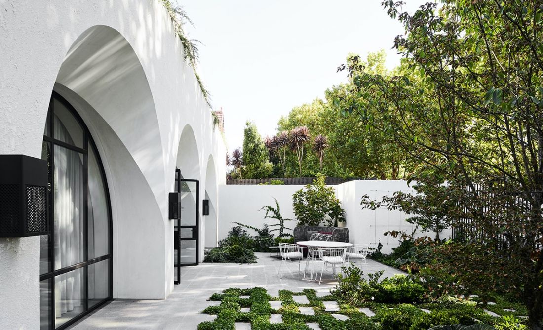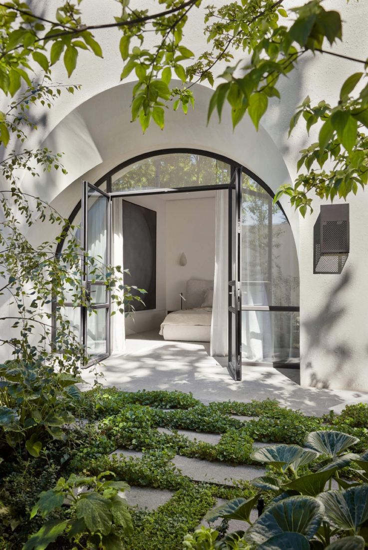 Thiết kế cổng mái vòm cùng với khung cảnh hữu tình đã tạo nên một bức màn sống động trước cổng ra vào.