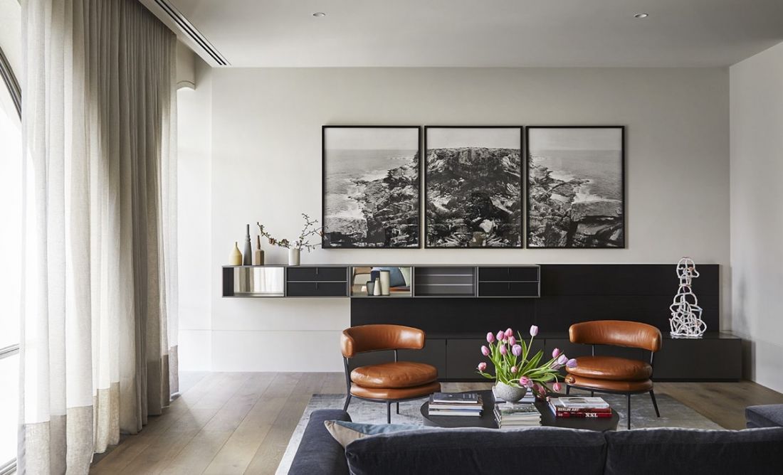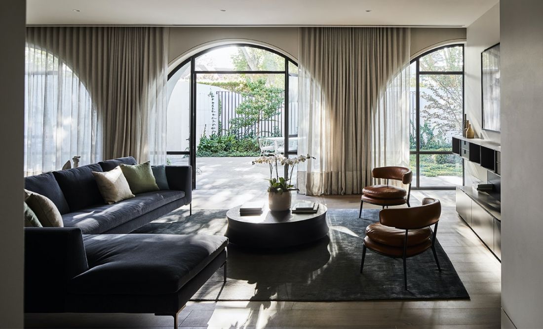 Bước vào không gian bên trong cũng giúp chủ nhân tận hưởng cuộc sống bình yên, lặng lẽ với thiết kế nội thất kiến trúc uốn lượn tạo sự gắn kết các chi tiết trang trí với nhau. Chiếc bàn cafe tròn là vị trí trung tâm, là "trái tim" của phòng khách sang trọng này.