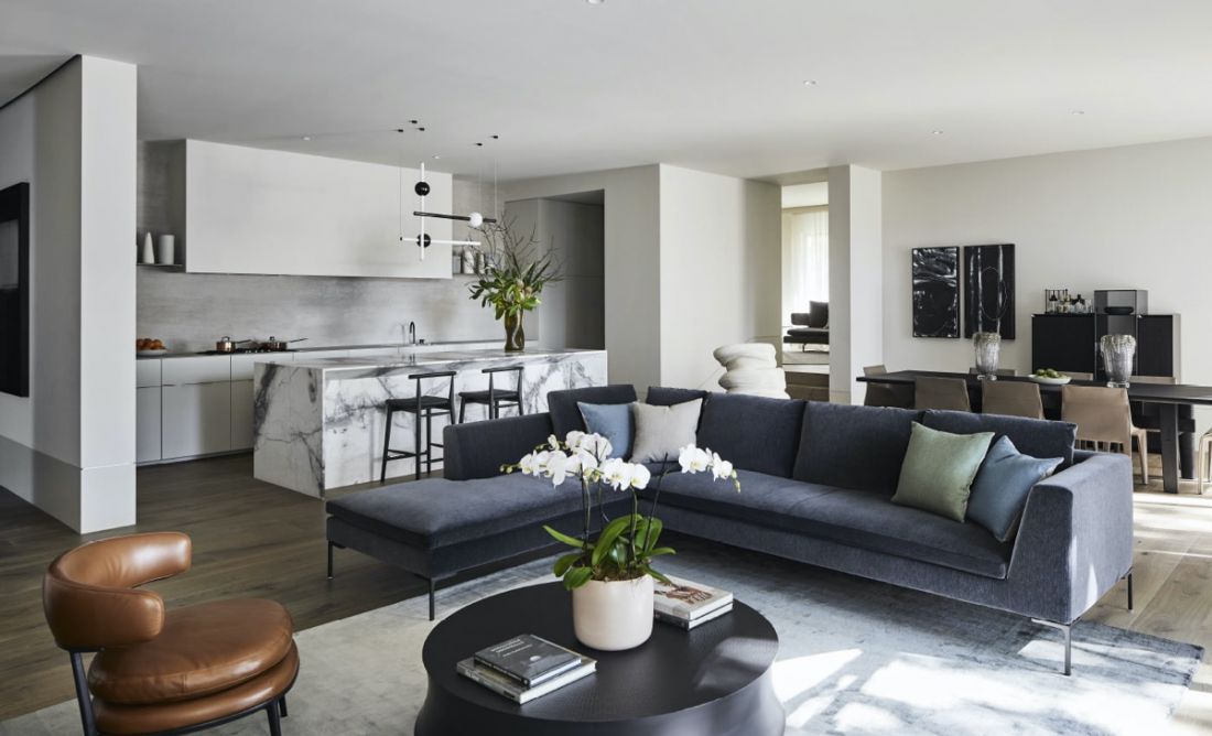 Khu vực bếp được phân biệt phòng khách thông qua cột bê tông trắng. Khá sang trọng và hiện đại không kém khi dùng đá cẩm thạch để ốp, đồng thời tô điểm thêm một bình hoa tươi... tất cả làm nên không gian bếp trở nên sinh động và lôi cuốn hơn.