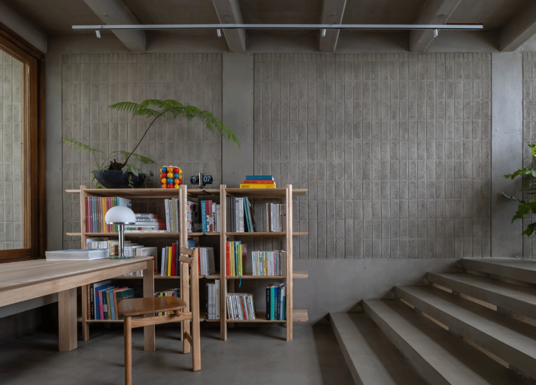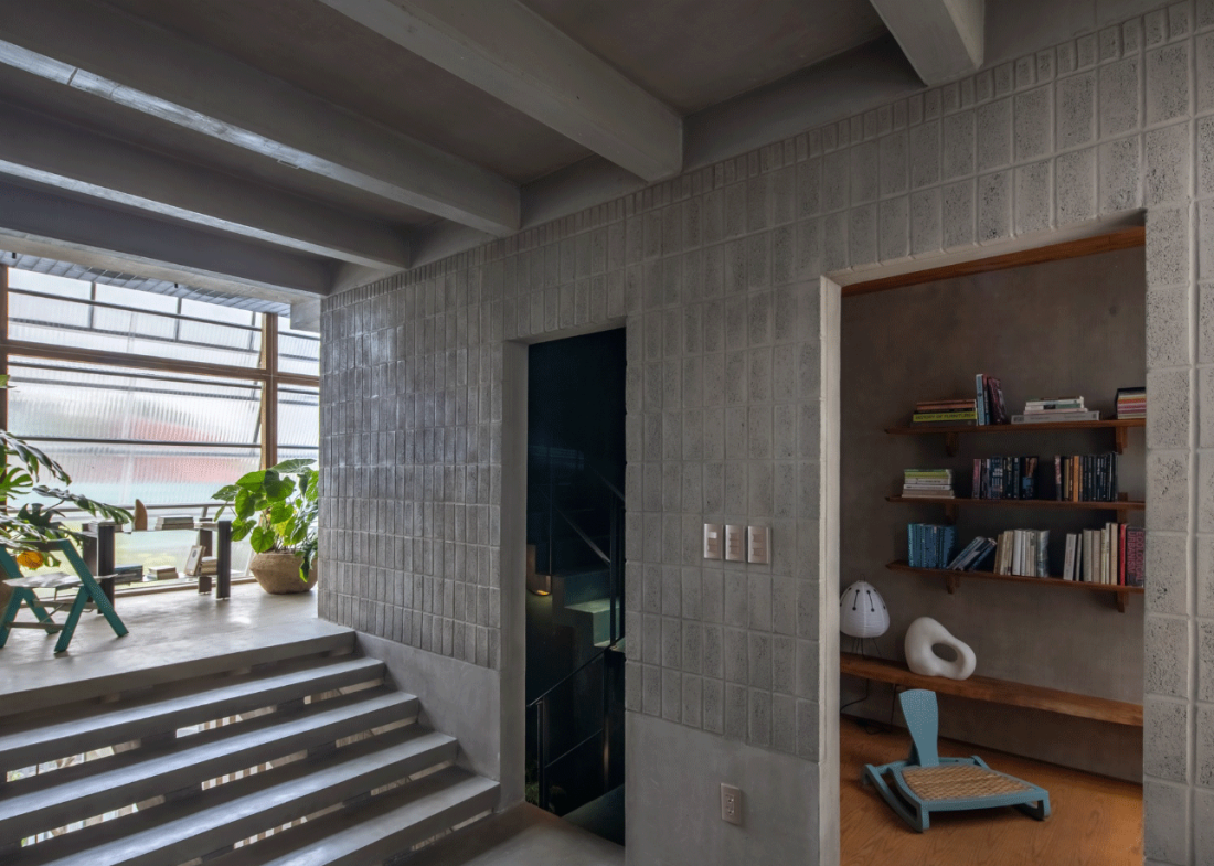 Những bức tường xây từ gạch bê tông không nung giá rẻ nhưng được sắp đặt với tỷ lệ hoàn hảo. Sàn nhà Terrazzo bóng mịn là kết quả của quá trình mài giũa kiên nhẫn và tỉ mỉ.