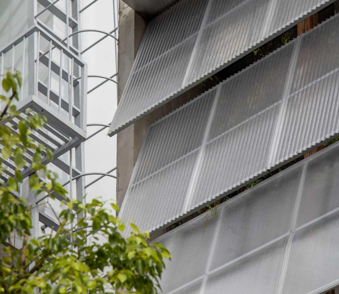 Lớp vỏ là bộ lọc của nắng và gió: Toàn bộ mặt tiền được bao bọc bởi hệ cửa chớp polycarbonate mờ với họa tiết dập sóng đa tỷ lệ. Đây chính là lá phổi của ngôi nhà.