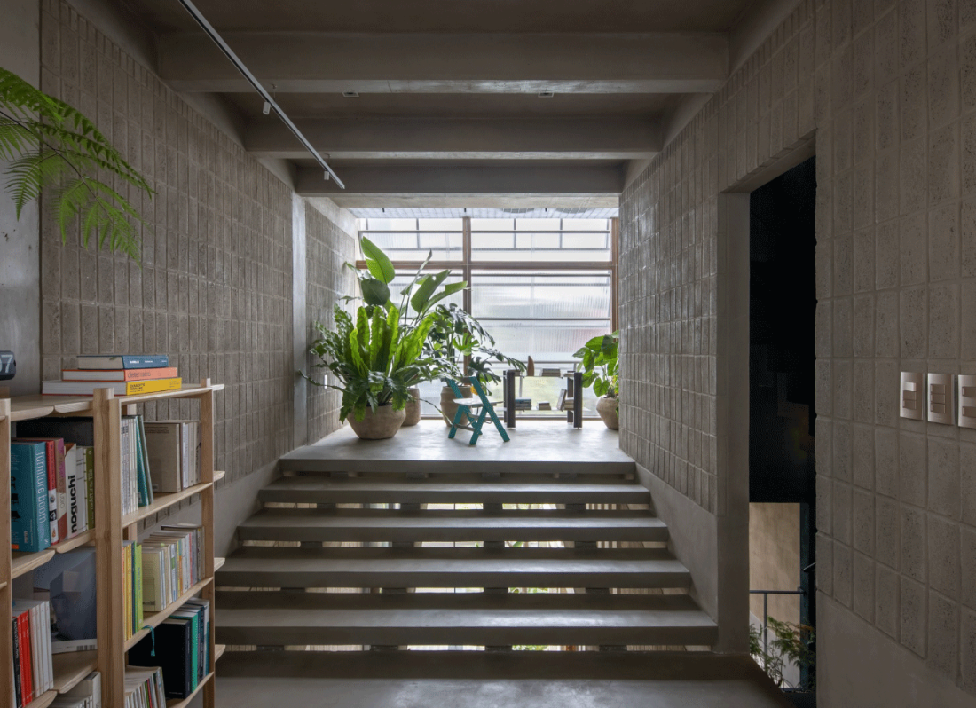 Giải pháp này giải phóng hoàn toàn phần diện tích còn lại cho các hoạt động linh hoạt: đọc sách, triển lãm và nghỉ ngơi. Không gian vì thế trở nên xuyên suốt, nơi gió hẻm có thể tự do đi qua lớp cửa lá sách mặt tiền và thoát ra ở phía sau, tạo nên sự thông thoáng tuyệt đối.