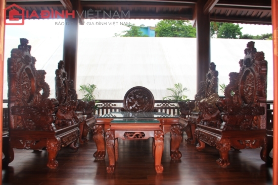 Phần gầm nhà sàn được bố trí hàng chục bộ bàn ghế bằng gỗ lim nguyên khối.
