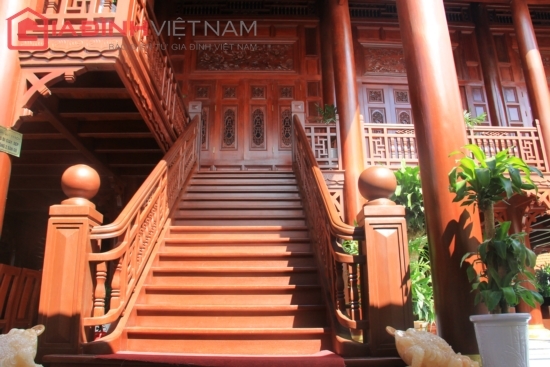 Cầu thang lên nhà sàn được làm hoàn toàn bằng gỗ lim.