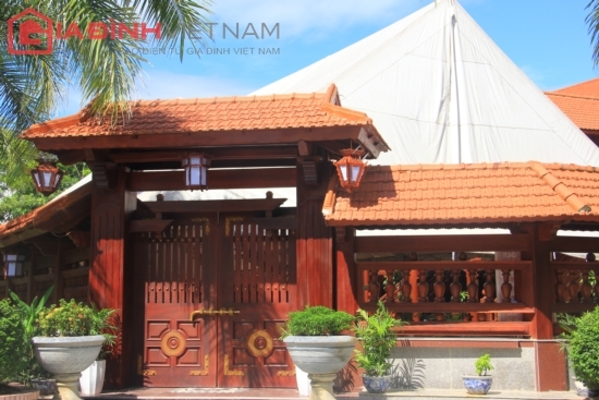 Cổng gỗ của ngôi nhà sàn gỗ lim.
