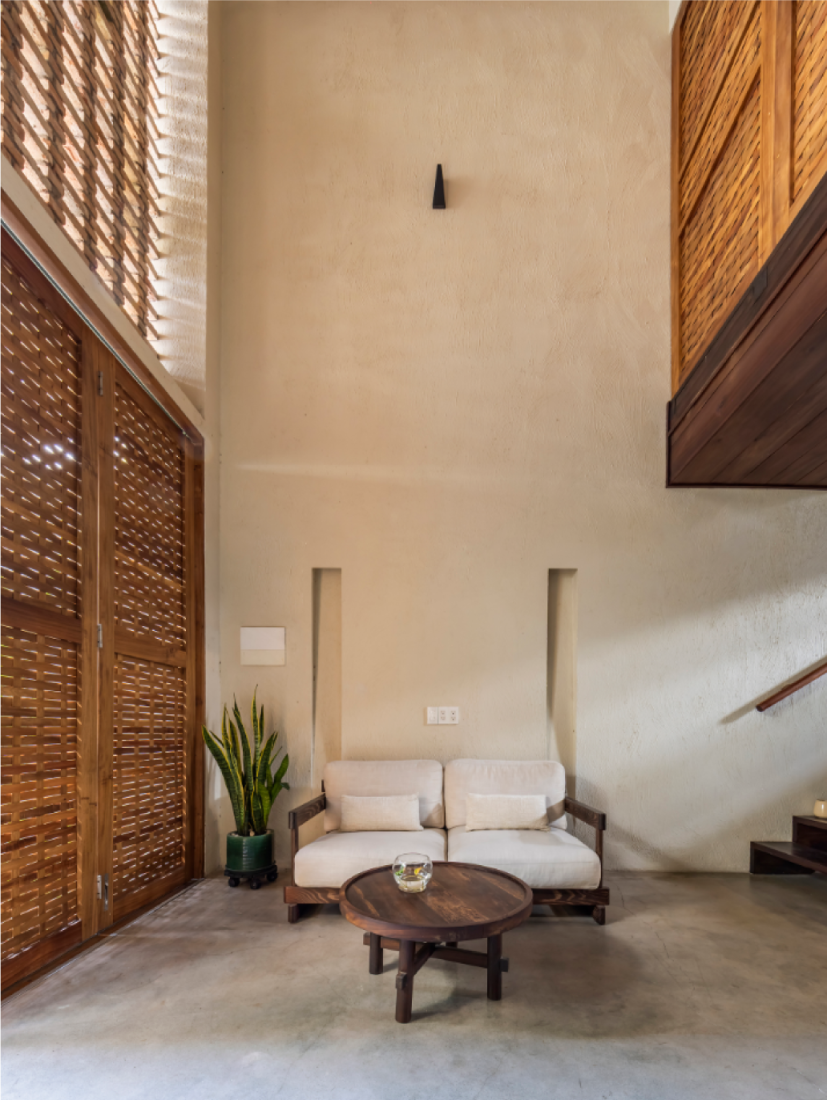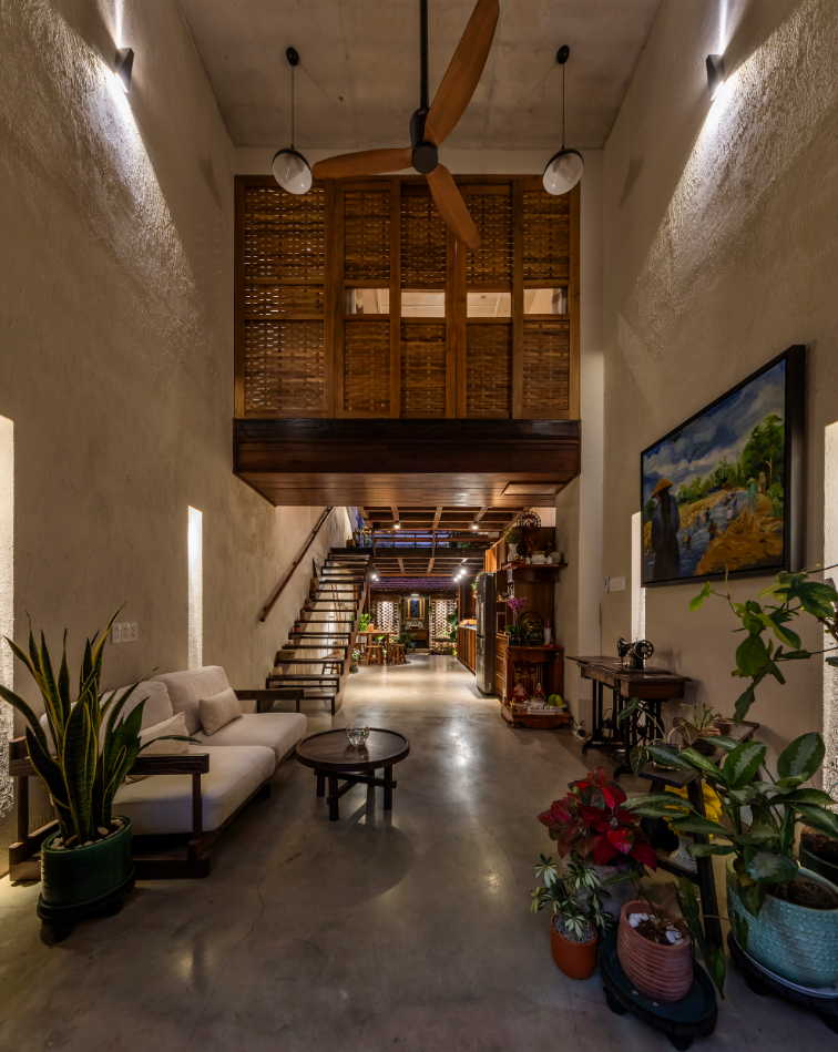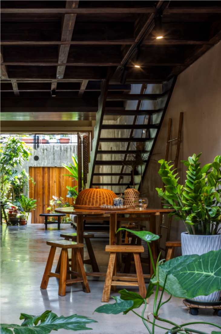Bước vào nhà, ranh giới giữa hẻm nhỏ và không gian sống dường như tan biến. Một khu vườn xanh mướt tràn vào không gian phòng khách, tạo nên một vùng đệm mềm mại. Sàn nhà được nâng cao một cách tinh tế, đủ để đánh dấu sự riêng tư nhưng vẫn giữ được sự kết nối thị giác xuyên suốt.
