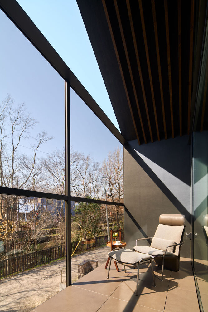 Ban công phía trước nhà là khoảng đệm dôi ra bằng kính tạo nên hàng hiên sâu có vai trò quan trọng cho việc chuyển đổi giữa công việc và giải trí. Đồ nội thất tại ban công cũng tương tự như bên trong nhà mang tính liền mạch.