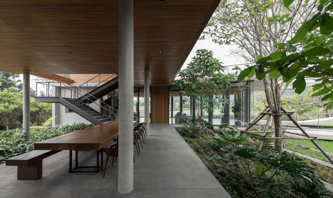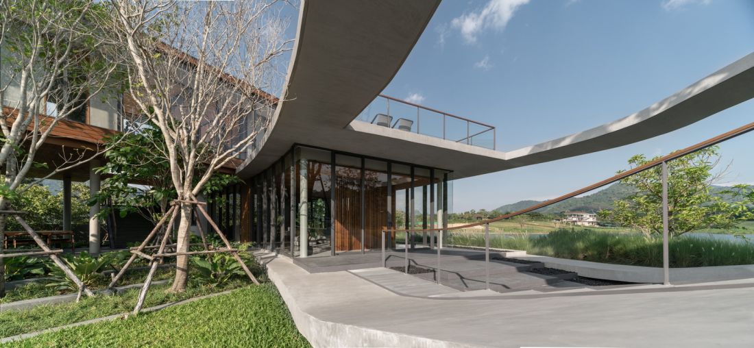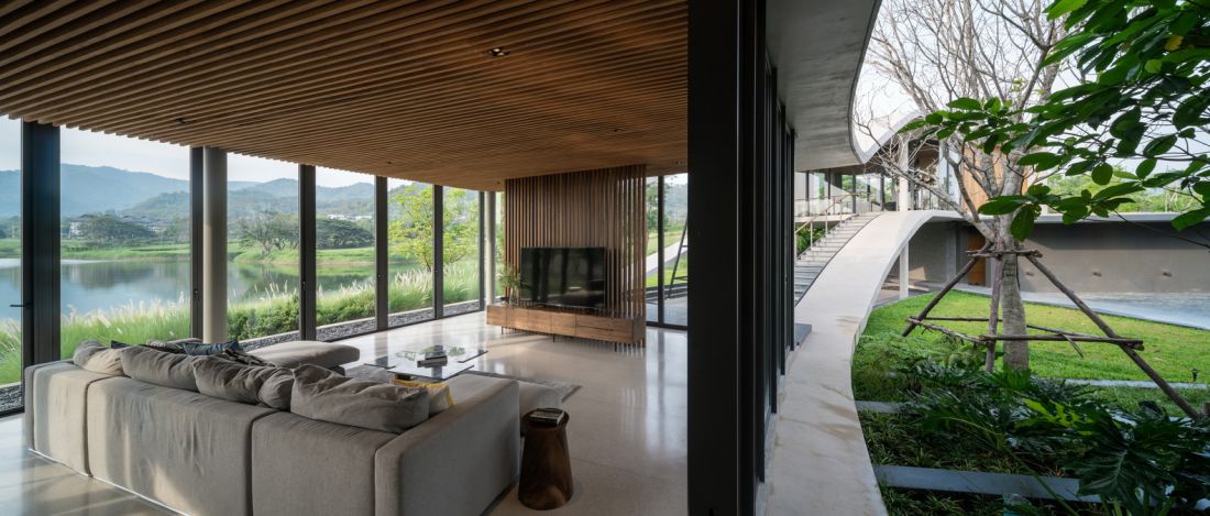 Nằm ngay trên khúc cua của dòng sông, khu đất mở ra tầm nhìn bao quát toàn cảnh hồ phía trước và những ngọn núi xa xa. Mặc dù là ngôi nhà nghĩ dưỡng nhưng trọng tâm chính vẫn là không gian sinh hoạt dành cho hai thế hệ. Chính vì vậy, mặt bằng ngôi nhà được phân bổ thành hai phần riêng biệt. Một là không gian gia đình yên tĩnh dành cho cha mẹ tại tầng trệt và không gian sinh hoạt chung, giải trí tiệc tùng ở tầng 1 và tầng trên cùng dành cho trẻ.