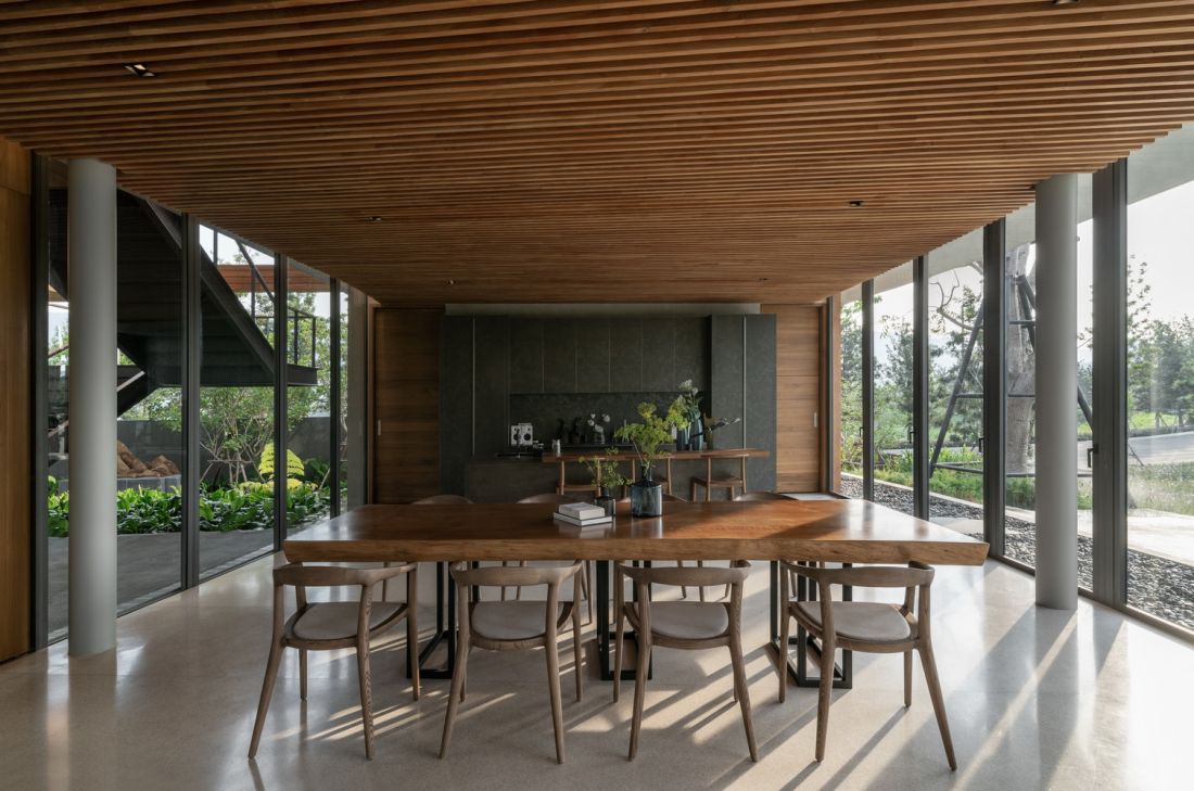 Vì ngôi nhà thường xuyên tiếp đãi khách nên bên trong thiết kế mở với nhiều hệ kính lớn tạo điều kiện tiếp nhận ánh sáng tự nhiên tốt hơn để nhìn thấy nét thơ mộng của những ngọn núi, mặt hồ trong xanh hòa quyện cùng cây xanh.