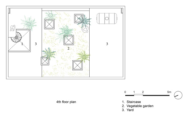 Ngôi nhà có bố cục gồm hai phần nhưng pha trộn hài hòa với nhau: khối hộp bê tông và phần mảng xanh khu vườn rộng nằm phía trước ngôi nhà với bể cảnh vườn cây, vườn rau trên mái nhà tạo khoảng đệm cũng như lọc ánh sáng và gió.