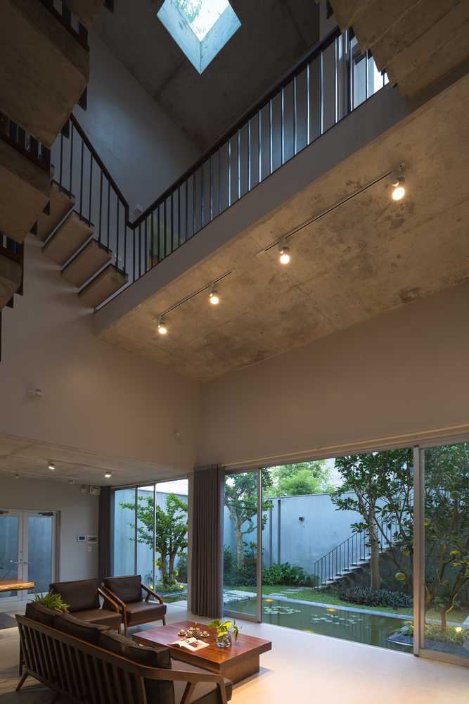 Qua khu vườn vào trong nhà là một không gian ba tầng mở ra trước mắt, tất cả đều chung giếng trời. Tầng 1 có phòng khách, phòng ăn và nhà bếp.