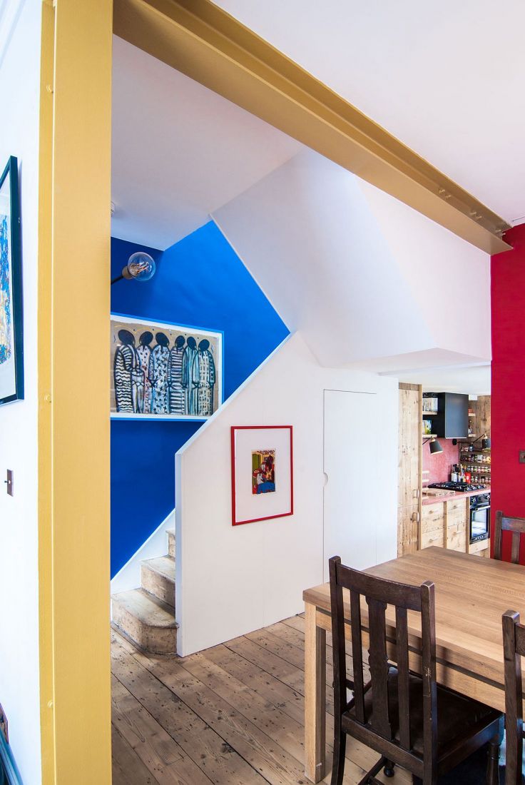 Hai màu trắng, xanh kết hợp cùng bức tranh treo tường độc đáo đã mang về một khu vực cầu thang nhiều nét riêng biệt.