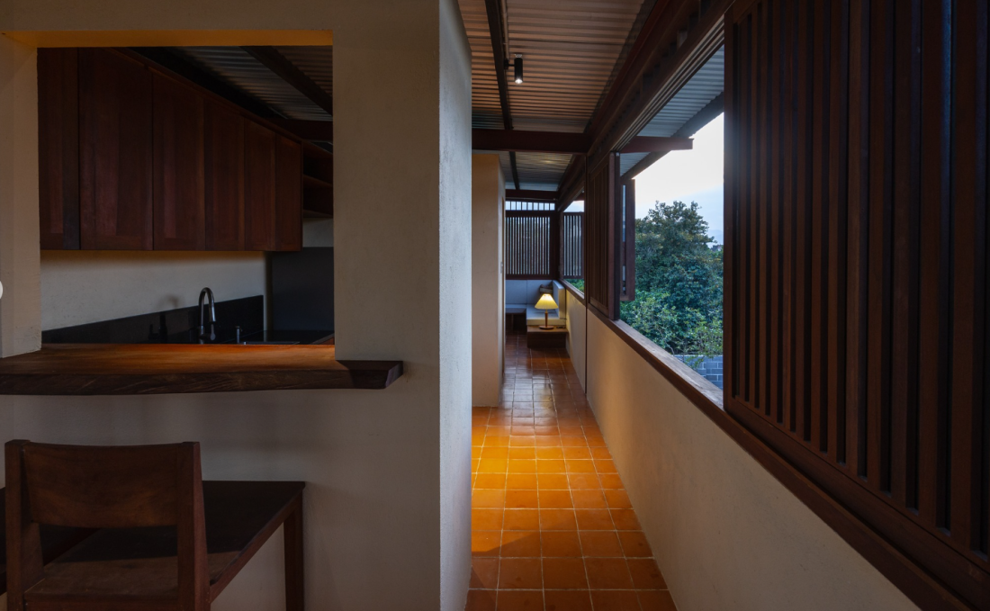 Hành lang dẫn lối vào 3 phòng ngủ tại tầng trệt và ngăn cách với sân trước qua hệ lam gỗ