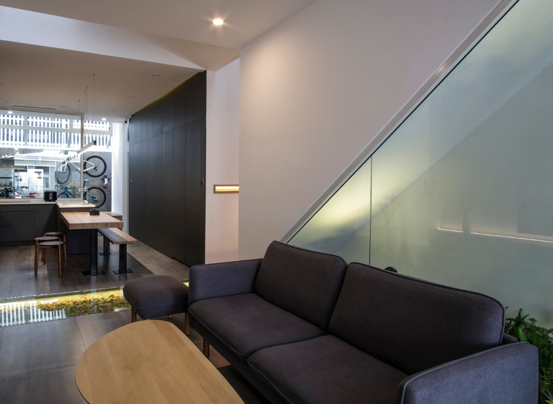 Đặc biệt, khối chức năng cắt xiên “treo” giữa facade, làm từ bê tông thô, như một tác phẩm nghệ thuật nổi bật giữa phố phường. Đây không chỉ là điểm nhấn thị giác mà còn là “tuyên ngôn” về phong cách sống hiện đại, cá tính của chủ nhân. Bất kỳ ai đi ngang qua cũng khó lòng quên được dấu ấn độc đáo này.
