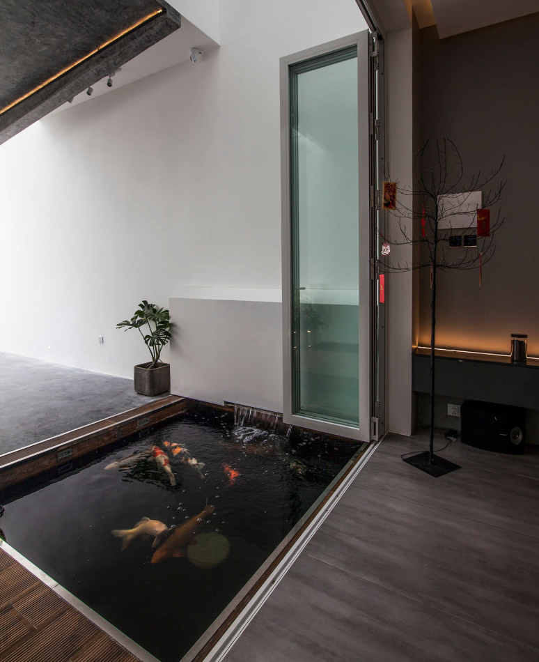 Ngay lối vào, một hồ nước nhỏ được thiết kế khéo léo, vừa giúp điều hòa không khí, mang lại sự tươi mát, vừa là nơi chủ nhân nuôi cá Koi – một sở thích cá nhân đầy thú vị.