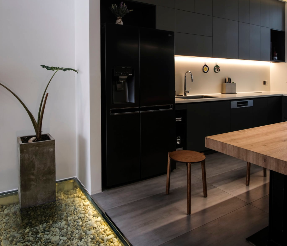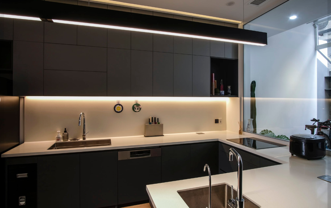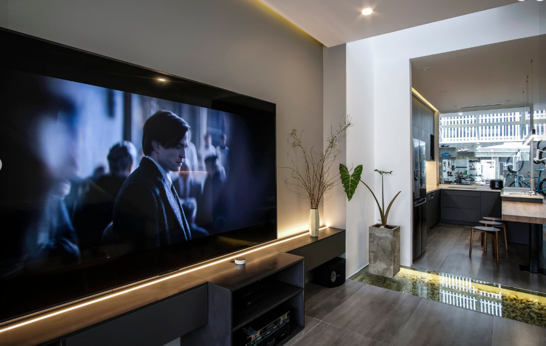 Các thiết bị âm thanh, hình ảnh và đồ dùng nhà bếp đều được chọn lọc kỹ lưỡng, đầu tư công nghệ cao, thể hiện rõ niềm đam mê gadget của gia chủ. Đứng ở đây, bạn sẽ cảm nhận được sự kết nối liền mạch, không rào cản giữa các khu vực – một không gian mở lý tưởng để gắn kết gia đình.