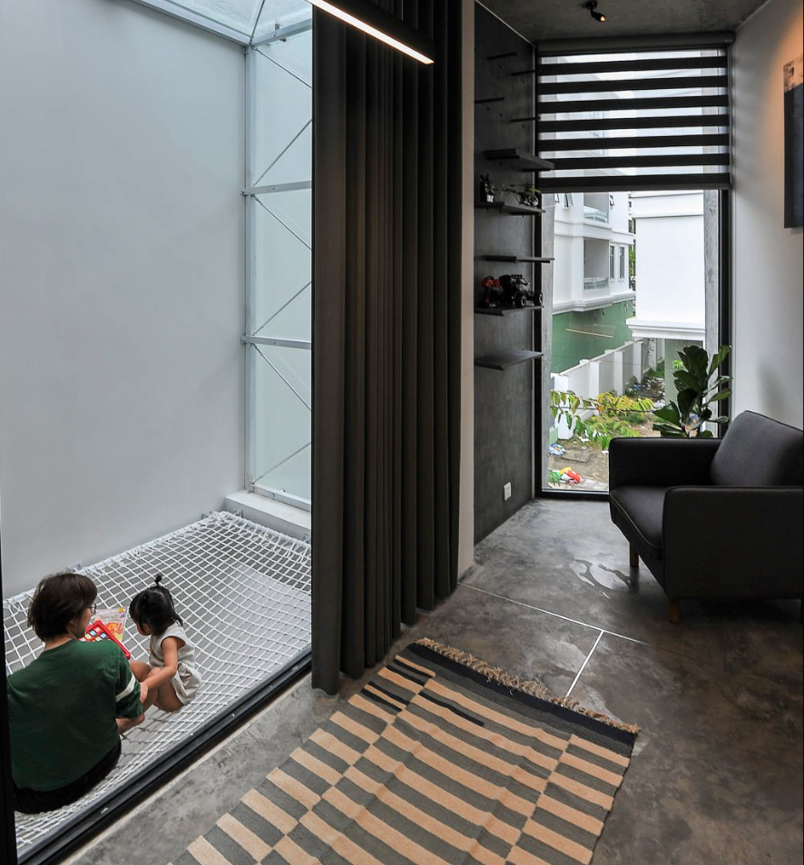 Màu sắc của ngôi nhà là một câu chuyện thú vị. Tầng trệt sử dụng xám đậm để tạo cảm giác mạnh mẽ, hiện đại, trong khi các tầng trên chuyển sang tông màu nhẹ hơn, mang lại sự ấm áp và cân bằng.