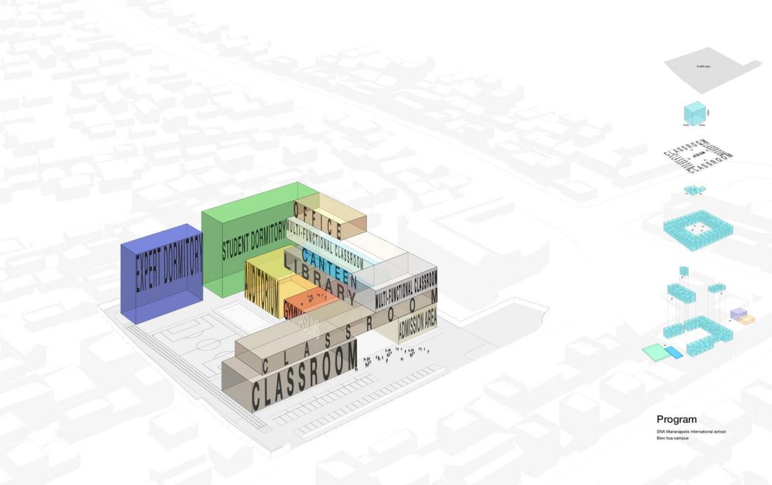 Về mặt chuyển động trong kiến trúc – Kiến trúc sư bắt đầu thiết kế các mô đun của tòa nhà dựa trên những tiêu chuẩn để tối ưu các phòng học. Họ tính toán tổng số phòng học, sau đó xếp chúng chồng lên nhau.