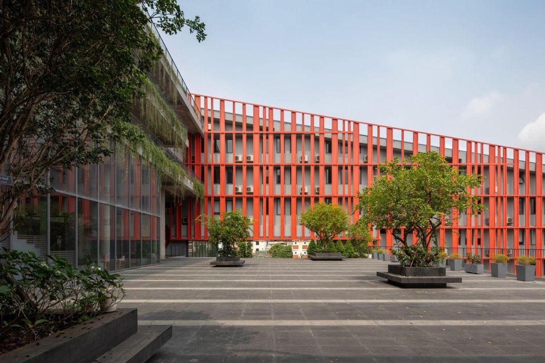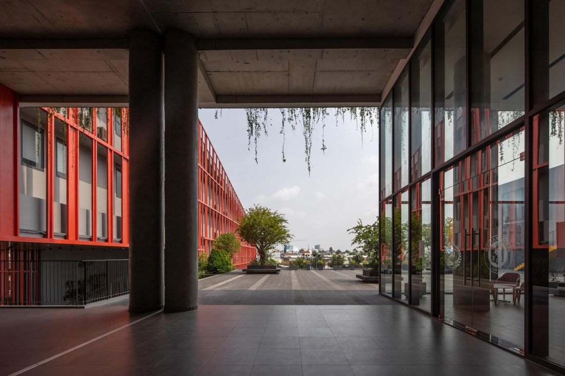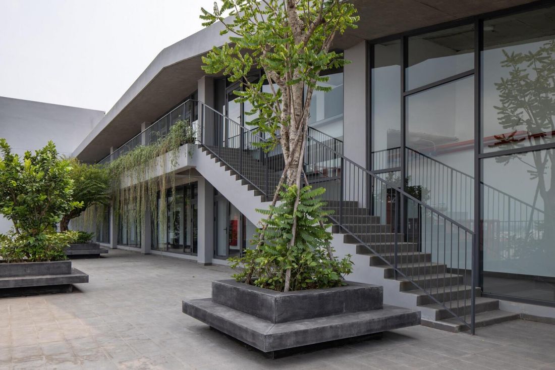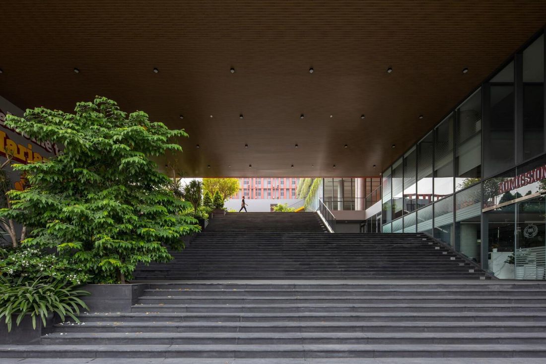 Cầu thang bộ của phần sảnh dài 24m tạo nên khu vực rộng lớn bên dưới nhằm giúp sinh viên và phụ huynh có thể giao lưu thuận tiện khi đưa đón con. Cầu thang từ nhà thi đấu có vai trò như một liên kết mở tới sân chơi lớn phía trước thư viện và nhà hát, giúp toàn bộ không gian được tương tác với nhau cũng như kết nối với trường học.