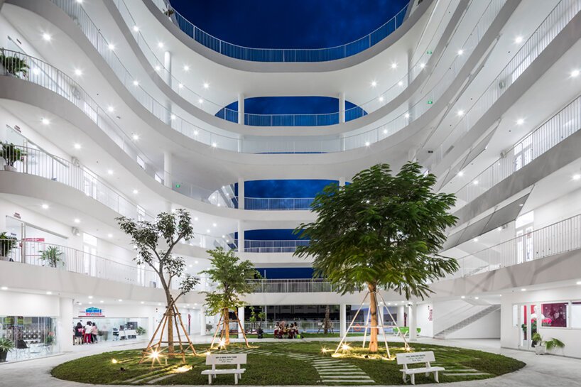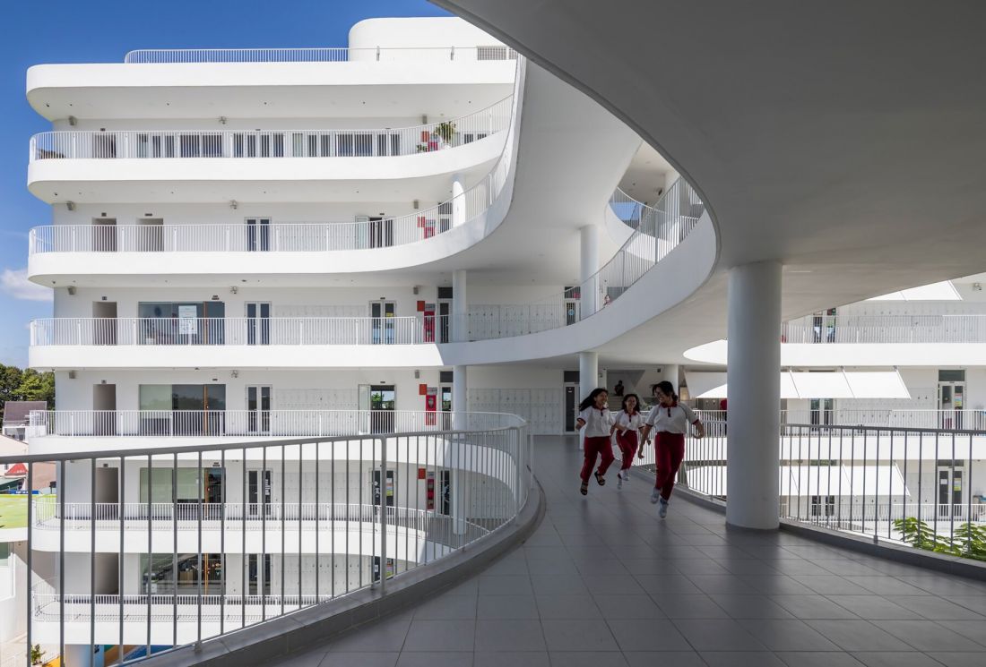Các không gian chức năng được lưu thông và sân trường thiết kế thoáng mát. Hành lang ví như khoảng đệm giữa trong và ngoài cung cấp bóng râm cho các hoạt động thể chất bên ngoài.