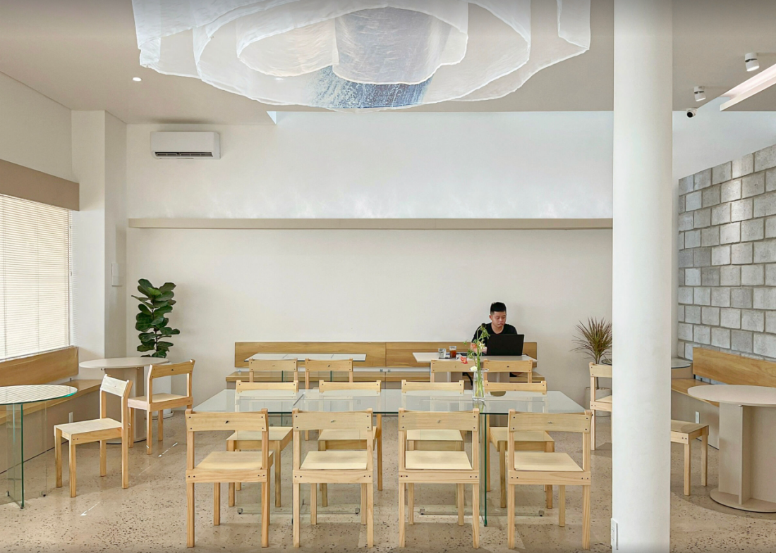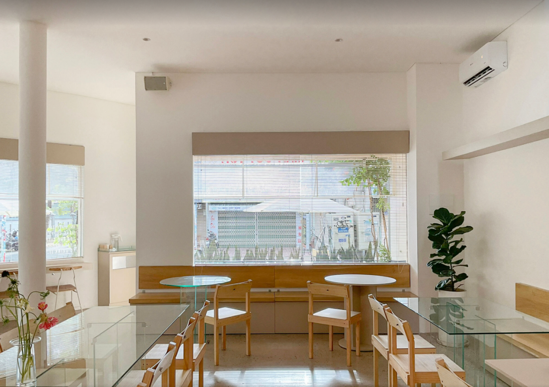Không gian nội thất: Bên trong quán café, cách bố trí chỗ ngồi dạng hình nan quạt mang lại sự linh hoạt và tiện nghi. Những chiếc bàn rộng rãi, ổ cắm điện và móc treo balo được bố trí hợp lý, biến nơi đây thành không gian lý tưởng cho học tập và làm việc.