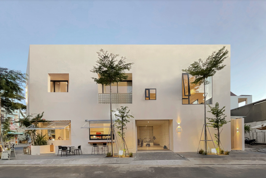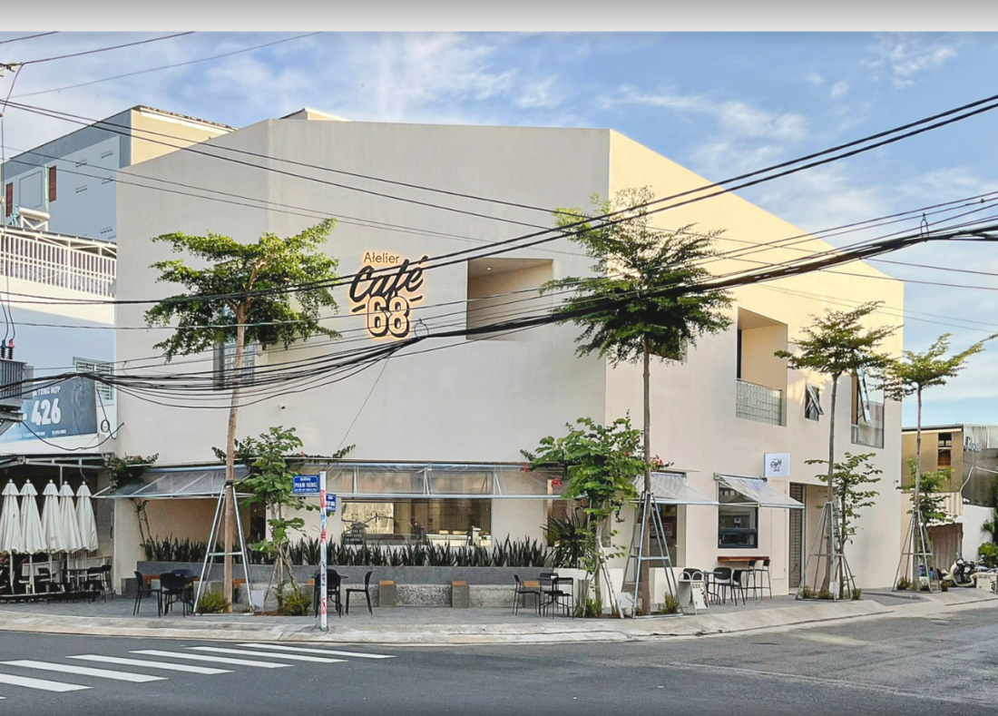 Ngay khi bước vào, bạn sẽ bị cuốn hút bởi quán café tại tầng trệt. Không gian được chia thành ba khu vực: trong nhà, hiên nhà, và ngoài trời.