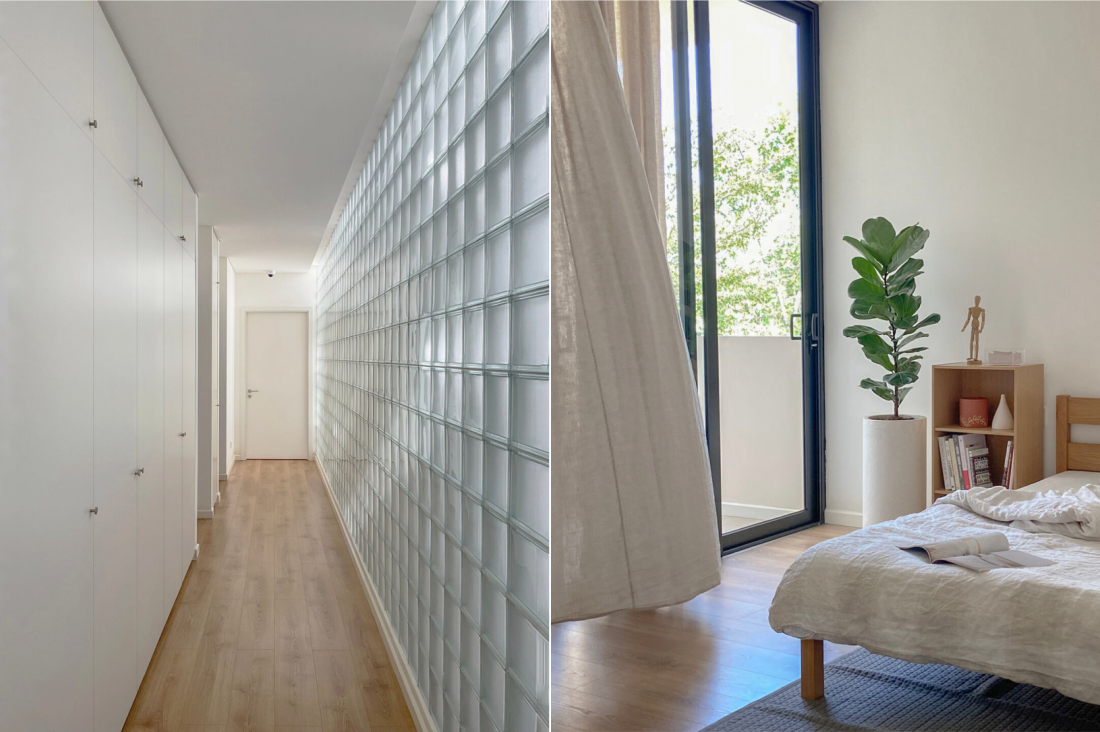 Chất liệu và màu sắc: là sự kết hợp tinh tế giữa các chất liệu như tường sơn trắng, tạo cảm giác rộng rãi và sạch sẽ. Gỗ tự nhiên, mang lại sự ấm áp và gần gũi. Gạch kính, tăng cường ánh sáng và tạo hiệu ứng thẩm mỹ độc đáo. Một vài chi tiết trang trí bằng gạch kính không chỉ làm tăng tính thẩm mỹ mà còn giúp ánh sáng lan tỏa mềm mại khắp căn phòng.